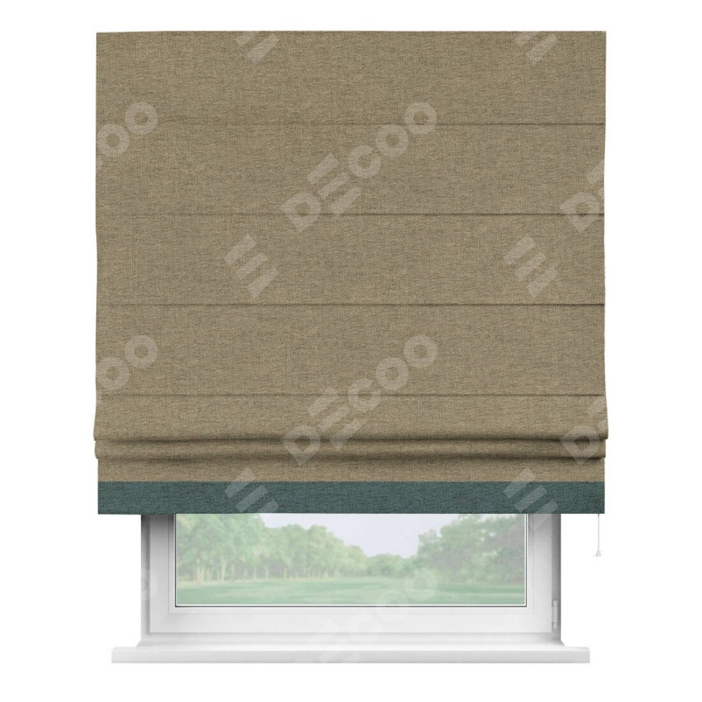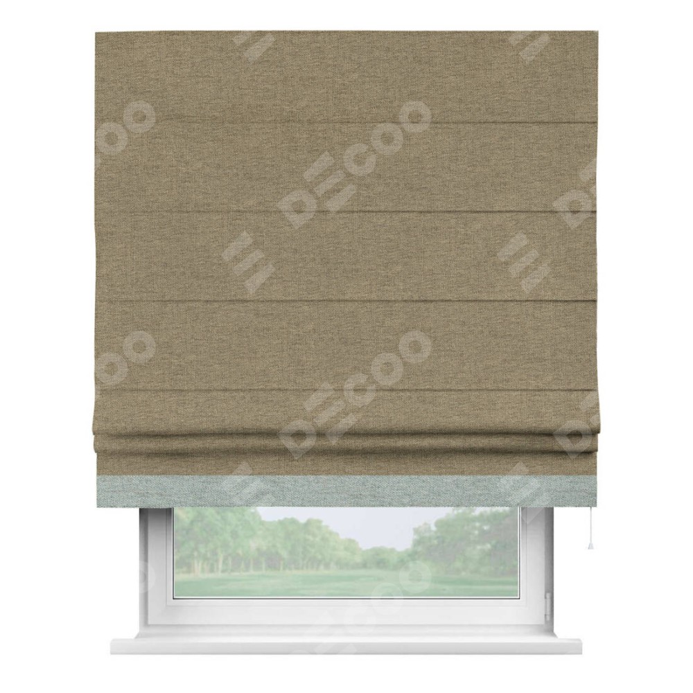 Римская штора производителя «Cortin», используется для проёма, пошита из ткани стиф димаут тёмно-бежевый, артикул 18085. Отделка шторы кантом «Джестер», ткань для канта используется из стифа разной расцветки на выбор. Имеет универсальный механизм и подходит для монтажа: на потолок, на стену и в нишу.