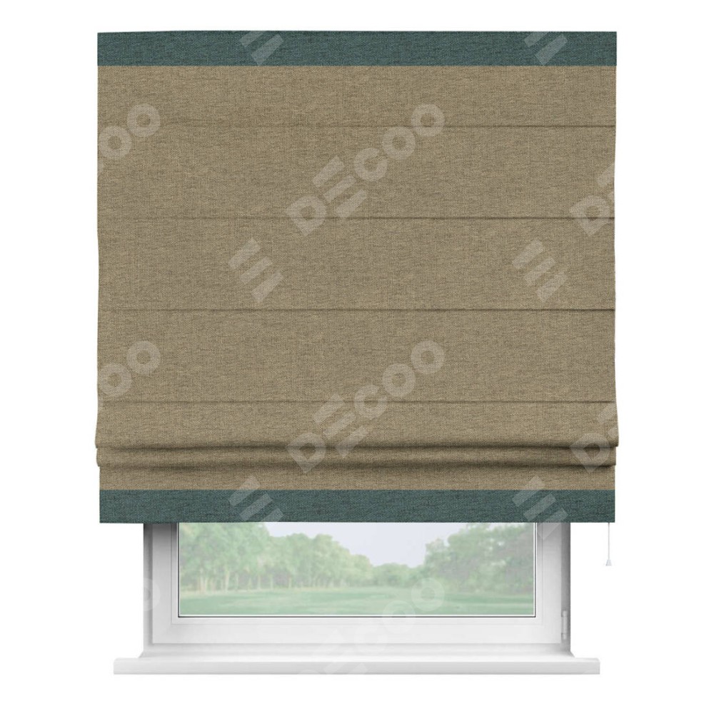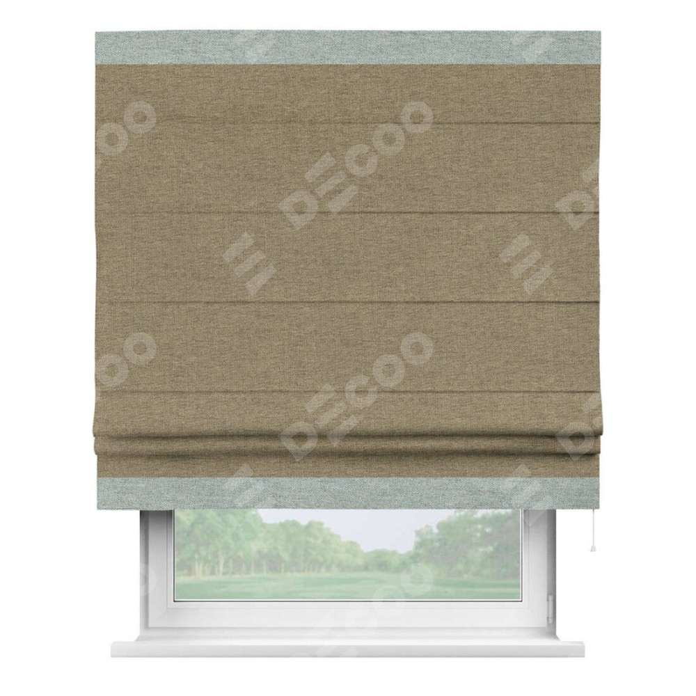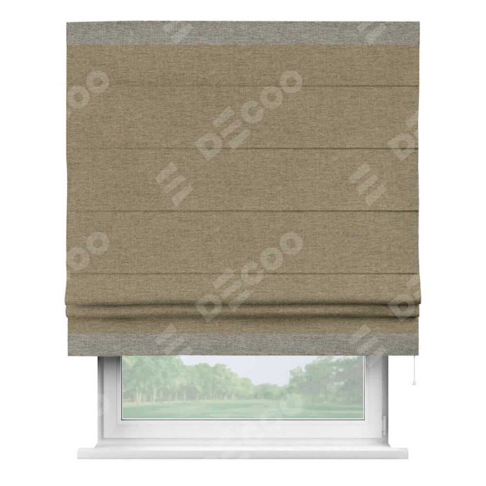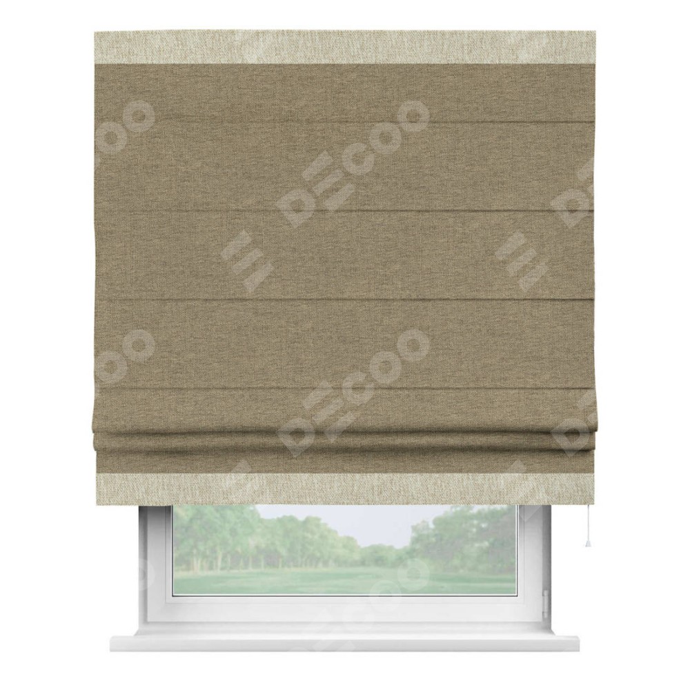 Римская штора производителя «Cortin», используется для проёма, пошита из ткани стиф димаут тёмно-бежевый, артикул 18085. Отделка шторы кантом «Горизонт», ткань для канта используется из стифа разной расцветки на выбор. Имеет универсальный механизм и подходит для монтажа: на потолок, на стену и в нишу.