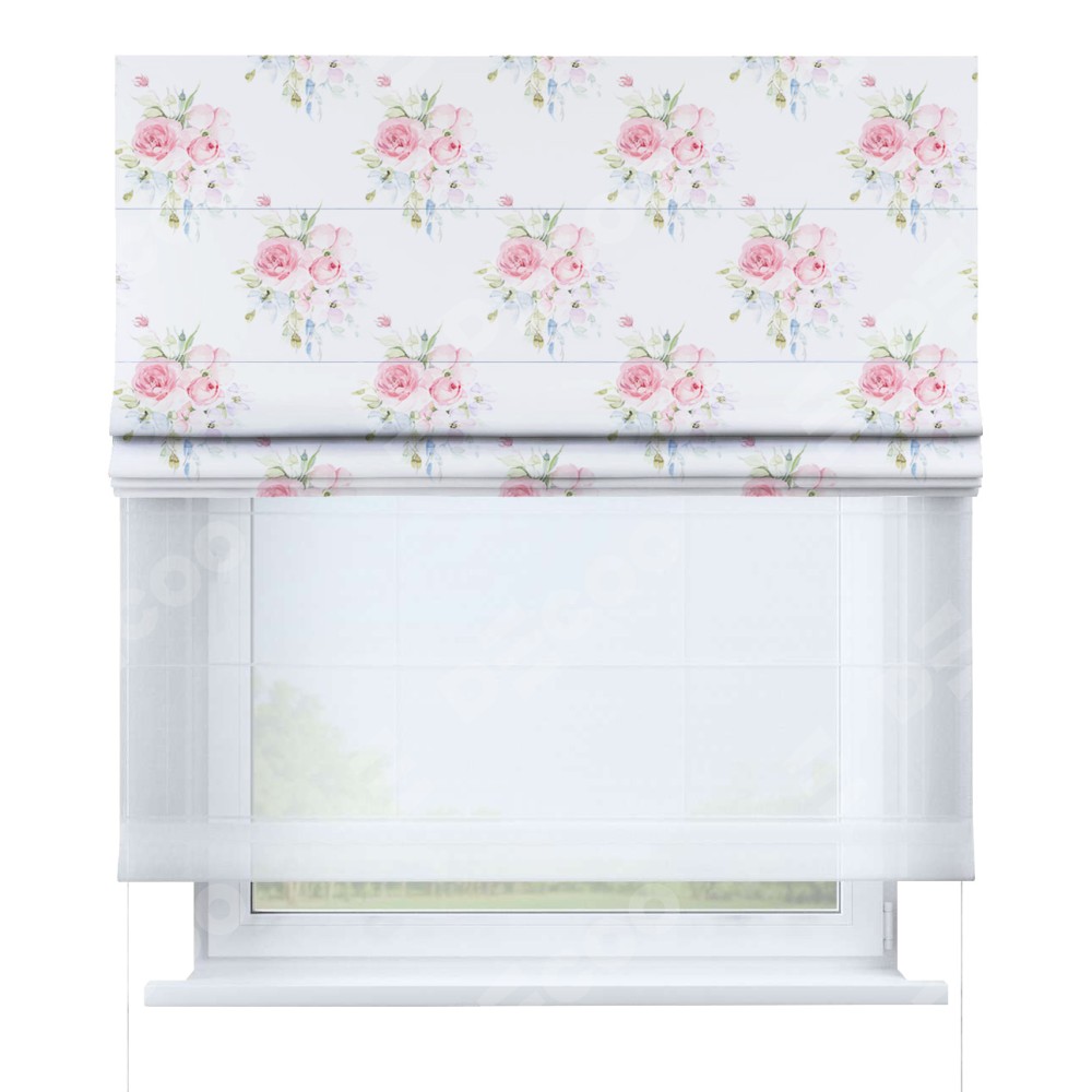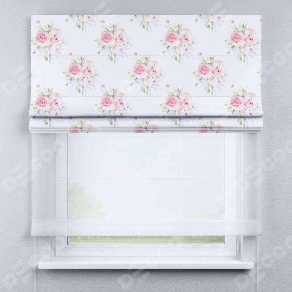 Римская штора день-ночь производителя «Cortin», используется для проёма, пошита из двух полотен, с лицевой блэкаут с нанесением сублимационной печати «Нежный розарий», вторая ткань тюль (по стандарту комплектуется тюль белого цвета артикул V-01). Имеет универсальный механизм и подходит для монтажа: на потолок, на стену и в нишу.