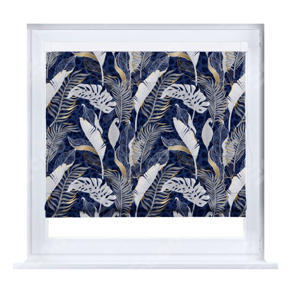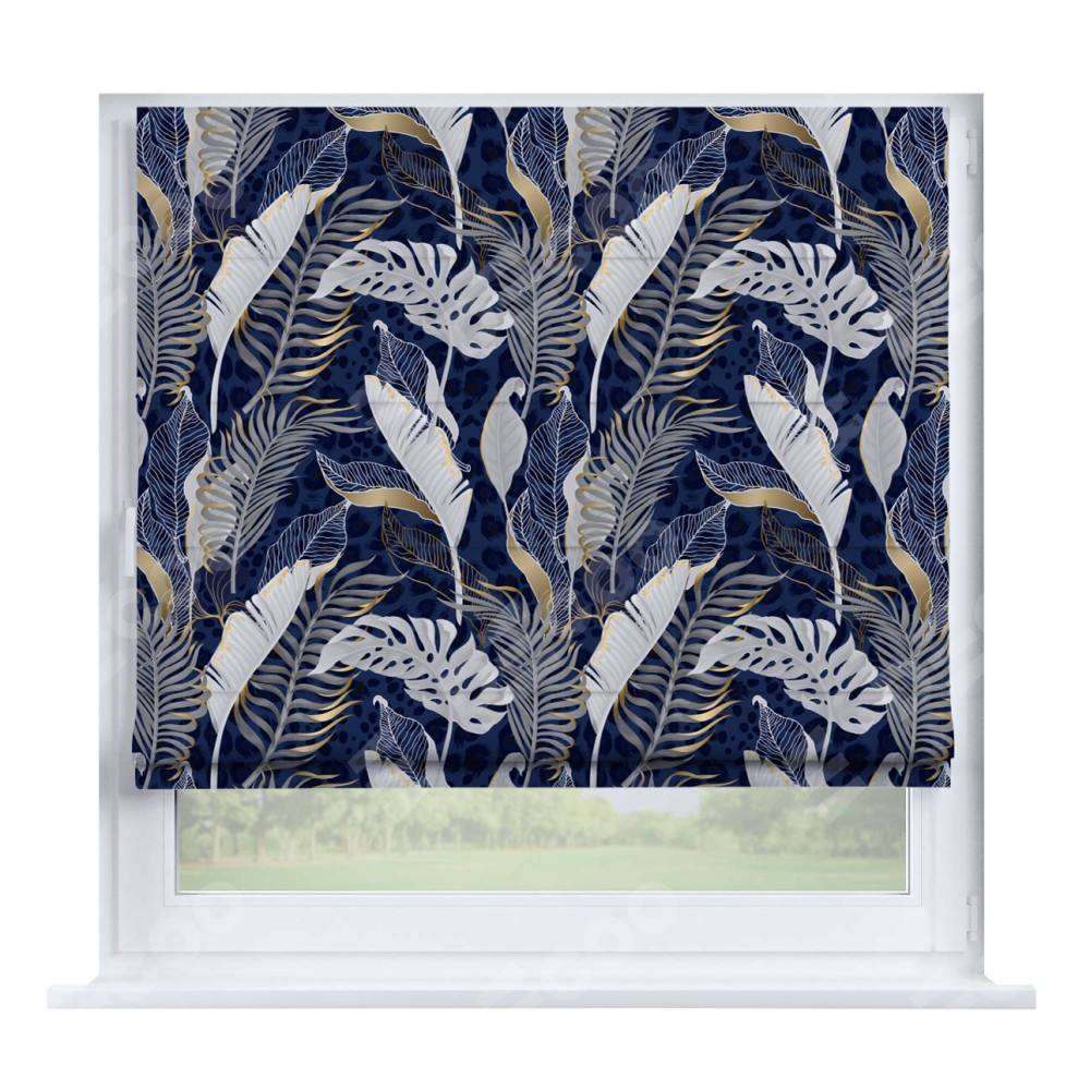 Римская штора «Кортин» на створку «Сине-золотые джунгли» отлично подойдёт для интерьера: в кухню, в офис и в гостиную.