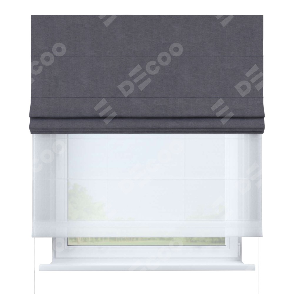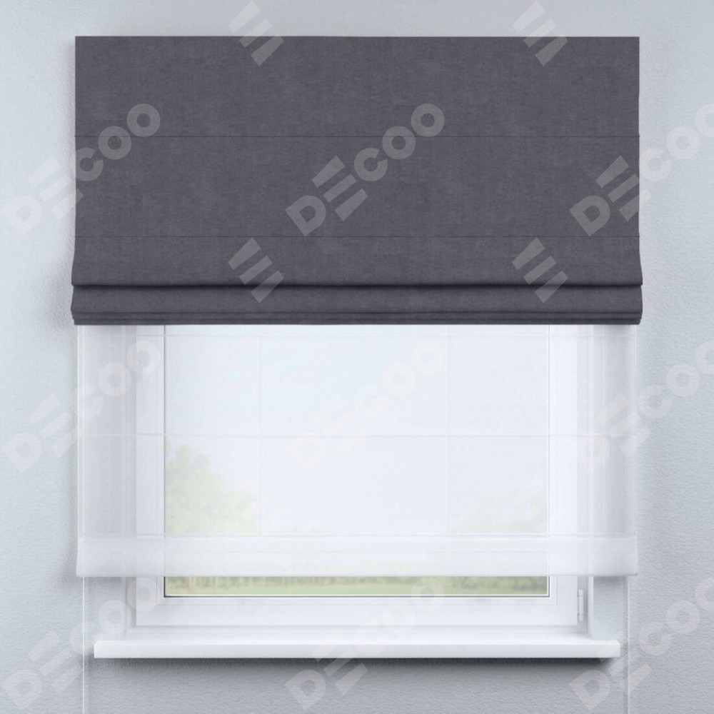 Римская штора день-ночь производителя «Cortin», используется для проёма, пошита из двух полотен, с лицевой стороны канвас лавандовый артикул v-223, вторая ткань тюль (по стандарту комплектуется тюль белого цвета артикул V-01). Имеет универсальный механизм и подходит для монтажа: на потолок, на стену и в нишу.