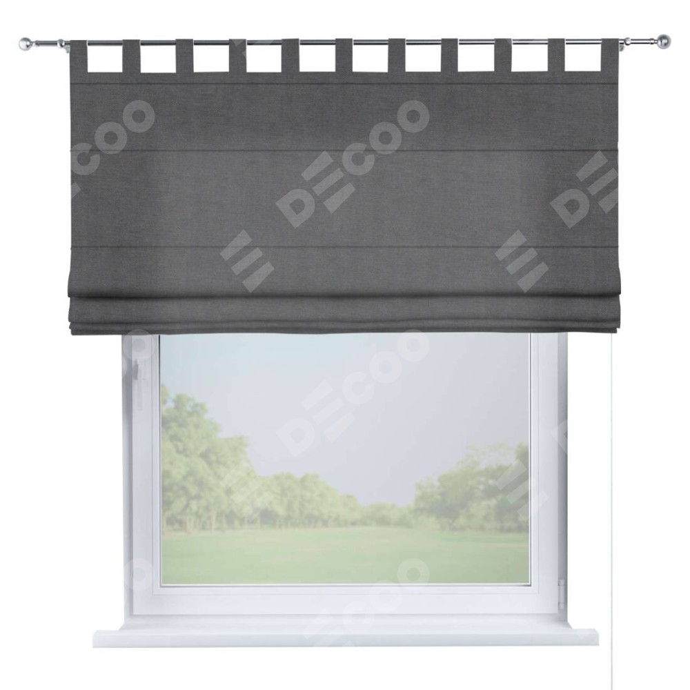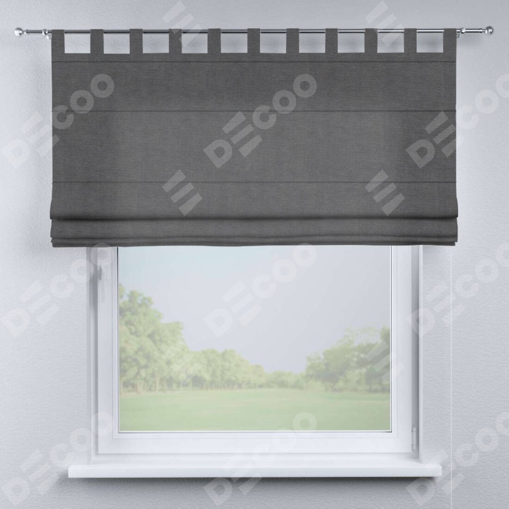 Римская штора производителя «Cortin», используется для проёма, пошита из ткани канвас мокрый асфальт, артикул ткани v-1083. Данная модель пошита на петлях, комплектуется на выбор круглым карнизом и подходит для монтажа на стену. Римская штора на петлях имеет простую систему регулировки высоты, отличительным преимуществом данной модели является простой способ монтажа. Достаточно повесить ее на трубу и штора готова!