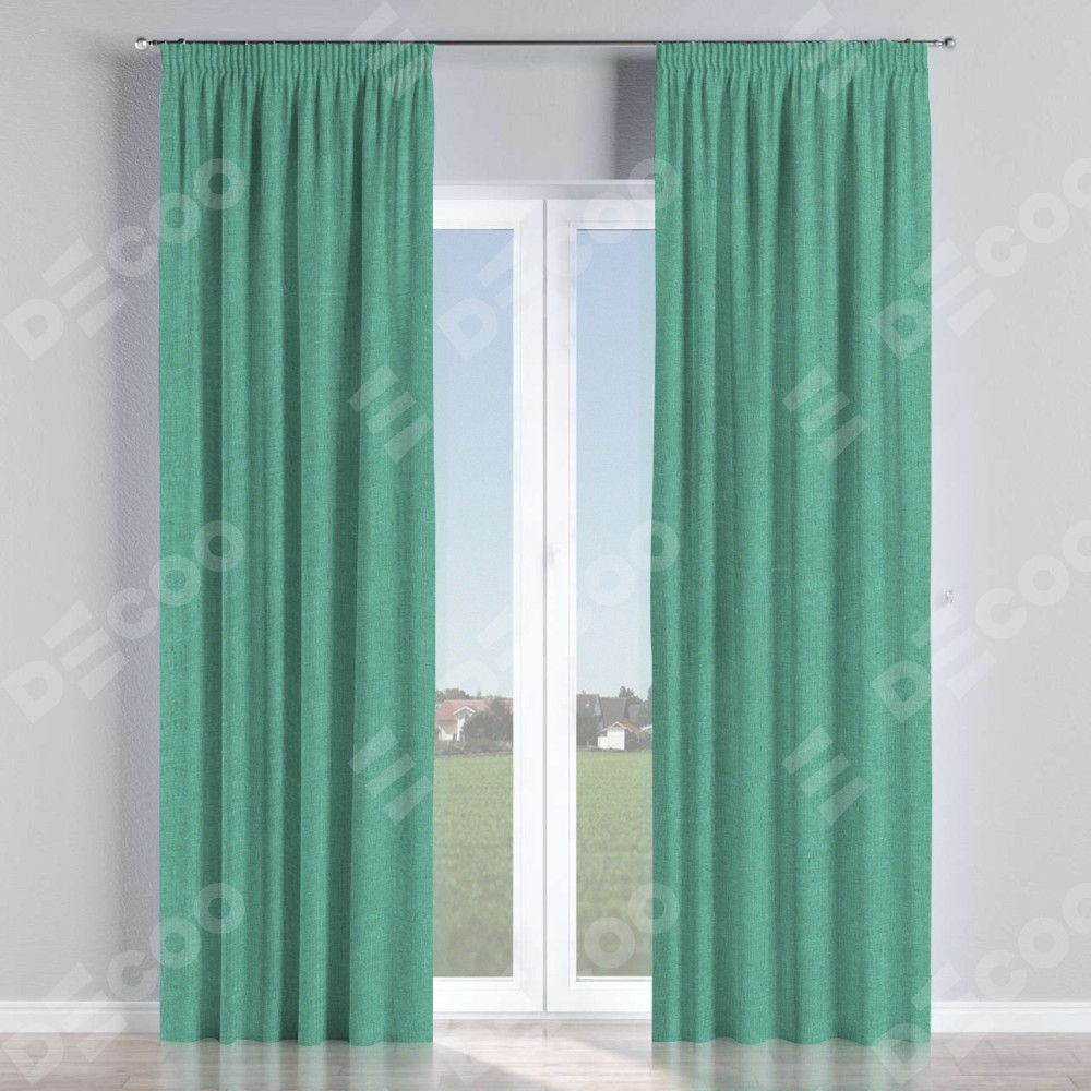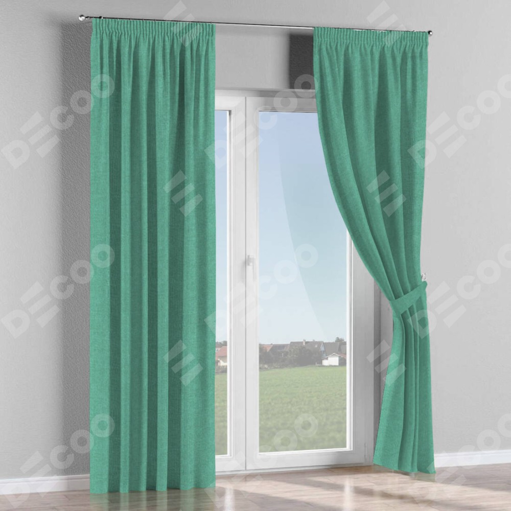 Комплект прямых штор, от производителя «Cortin», пошиты из ткани лён светло-бирюзовый, артикул ткани 53435. С изнаночной стороны в верхней части штор пристрачивается шторная лента с декоративными складками «Карандаш». Для создания элегантных складок прямые шторы шьются по стандарту с коэффициентом 1:2 (на 100 см. ширины проёма 200 см. ширины ткани).