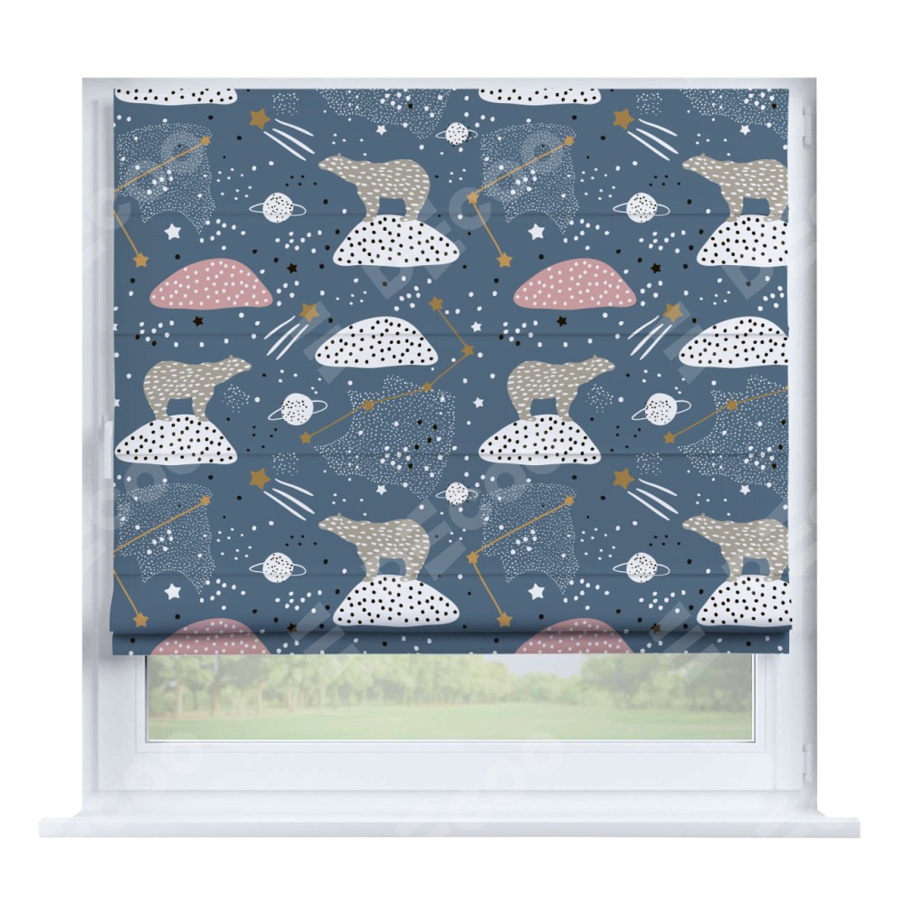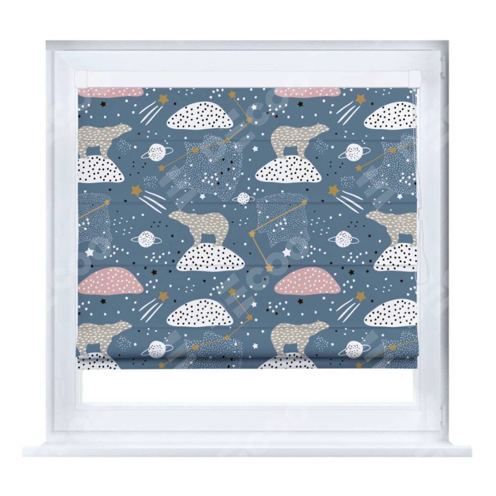 Римская штора производителя «Cortin», устанавливается на створку окна, пошита из ткани блэкаут с нанесением сублимационной печати «Белые медведи». Штора шьётся по индивидуальным размерам, для данного типа римской шторы возможная ширина от 35 до 150 см., высота до 250 см.