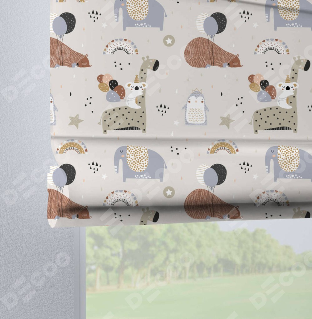 Римская штора «Кортин» на петлях «Вечеринка животных» отлично подойдёт для интерьера: в детскую.
