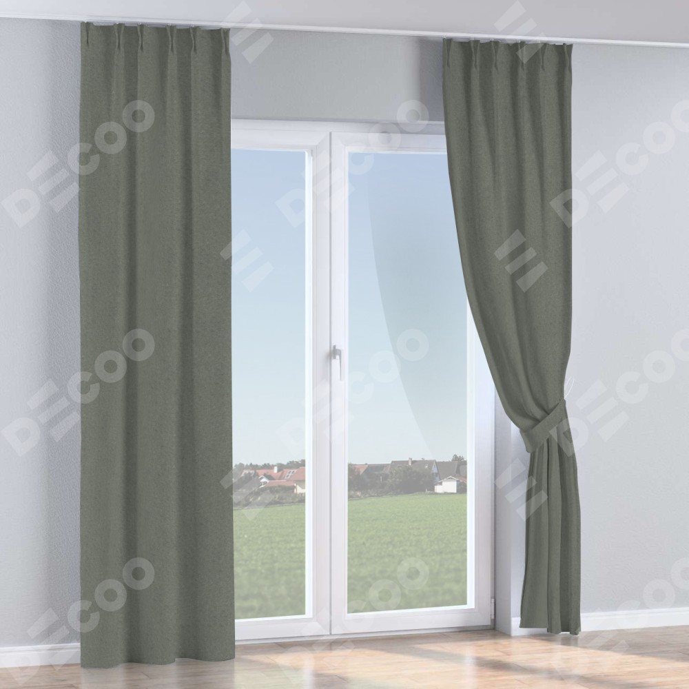Комплект прямых штор, от производителя «Cortin», пошиты из ткани лён димаут тёмно-серый, артикул ткани 91011. С изнаночной стороны в верхней части штор пристрачивается шторная лента с декоративными складками «Кустик». Для создания элегантных складок прямые шторы шьются по стандарту с коэффициентом 1:2 (на 100 см. ширины проёма 200 см. ширины ткани).