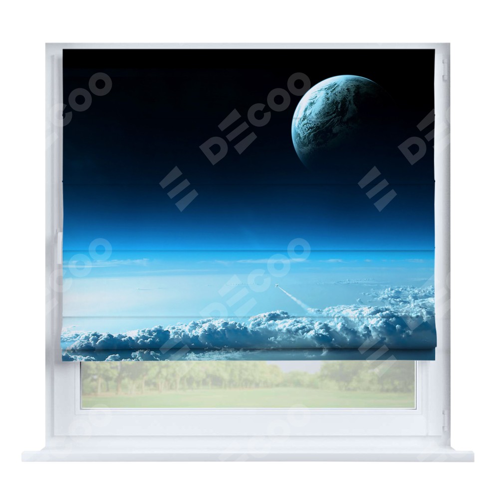 Римская штора производителя «Cortin», устанавливается на створку окна, пошита из ткани блэкаут с нанесением сублимационной печати «Горизонты вселенной». Штора шьётся по индивидуальным размерам, для данного типа римской шторы возможная ширина от 35 до 150 см., высота до 250 см.
