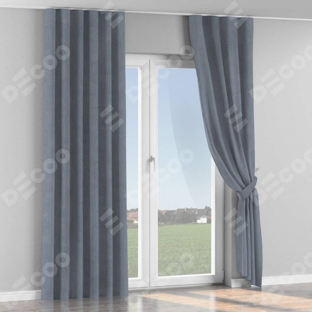 Комплект прямых штор, от производителя «Cortin», пошиты из ткани канвас васильковый, артикул ткани v-203. С изнаночной стороны в верхней части штор пристрачивается шторная лента с декоративными складками «Волна». Для создания элегантных складок прямые шторы шьются по стандарту с коэффициентом 1:2 (на 100 см. ширины проёма 200 см. ширины ткани).