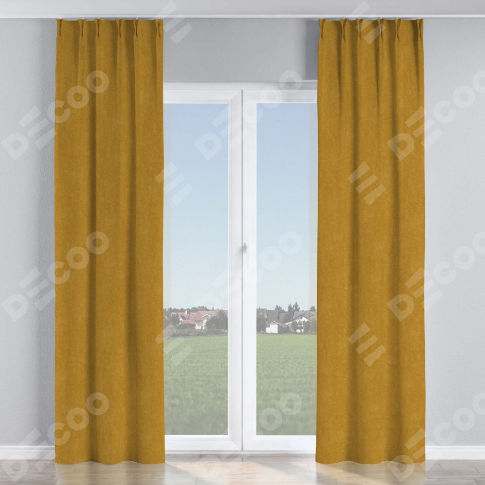 Комплект прямых штор, от производителя «Cortin», пошиты из ткани канвас горчица, артикул ткани v-476. С изнаночной стороны в верхней части штор пристрачивается шторная лента с декоративными складками «Кустик». Для создания элегантных складок прямые шторы шьются по стандарту с коэффициентом 1:2 (на 100 см. ширины проёма 200 см. ширины ткани).