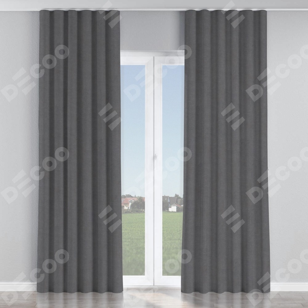 Комплект прямых штор, от производителя «Cortin», пошиты из ткани канвас мокрый асфальт, артикул ткани v-1083. С изнаночной стороны в верхней части штор пристрачивается шторная лента с декоративными складками «Волна». Для создания элегантных складок прямые шторы шьются по стандарту с коэффициентом 1:2 (на 100 см. ширины проёма 200 см. ширины ткани).