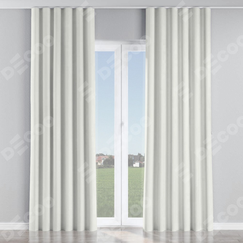Комплект прямых штор, от производителя «Cortin», пошиты из ткани канвас молочный, артикул ткани v-93. С изнаночной стороны в верхней части штор пристрачивается шторная лента с декоративными складками «Волна». Для создания элегантных складок прямые шторы шьются по стандарту с коэффициентом 1:2 (на 100 см. ширины проёма 200 см. ширины ткани).