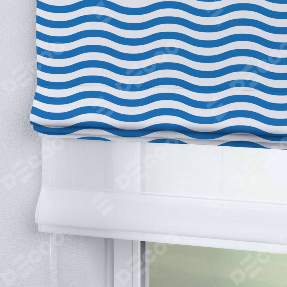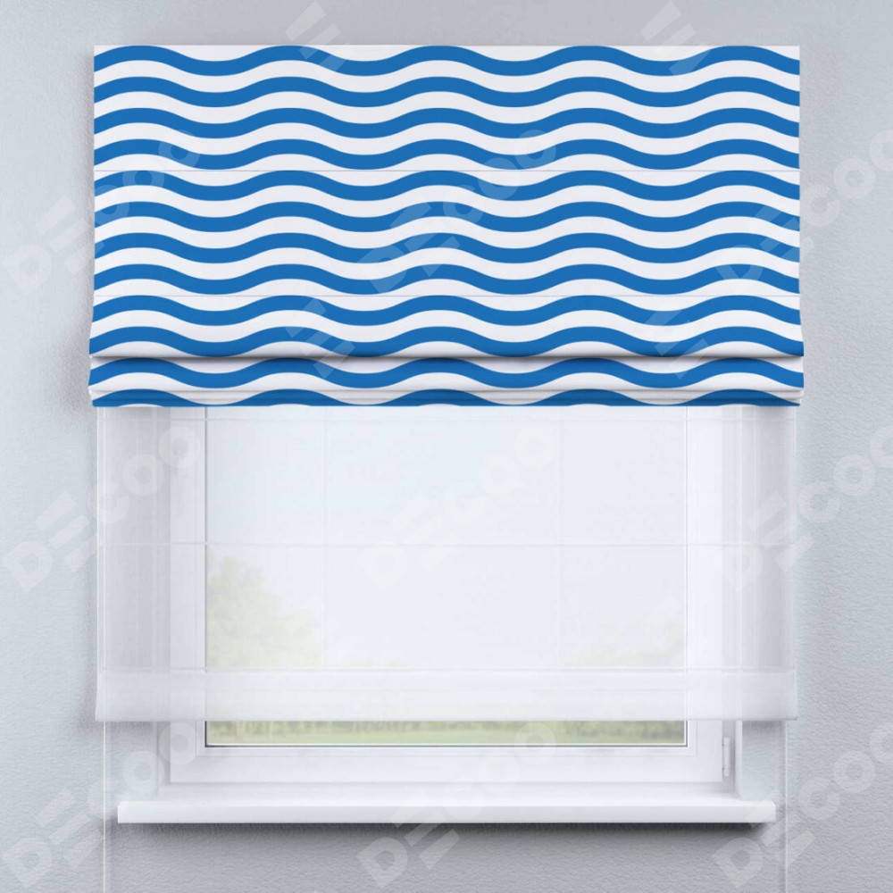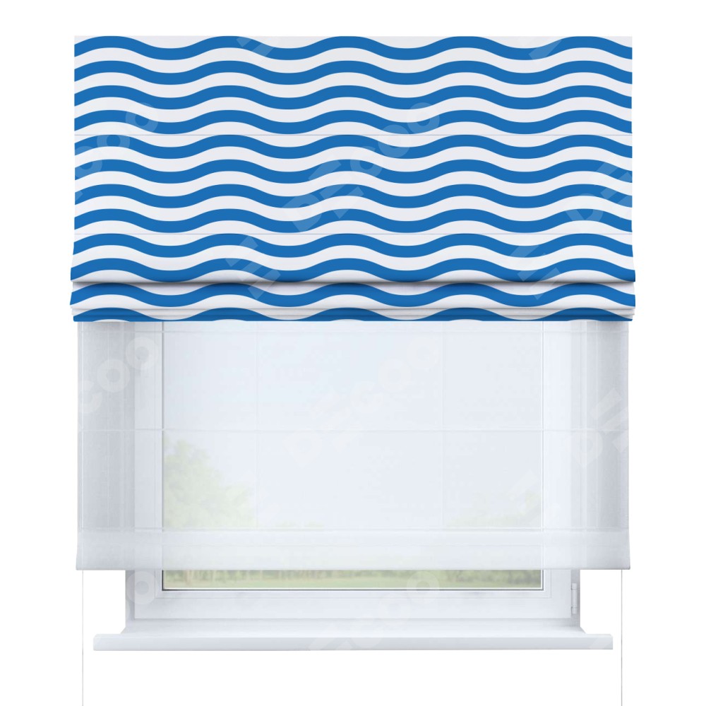 Римская штора день-ночь производителя «Cortin», используется для проёма, пошита из двух полотен, с лицевой блэкаут с нанесением сублимационной печати «Волнистые линии», вторая ткань тюль (по стандарту комплектуется тюль белого цвета артикул V-01). Имеет универсальный механизм и подходит для монтажа: на потолок, на стену и в нишу.