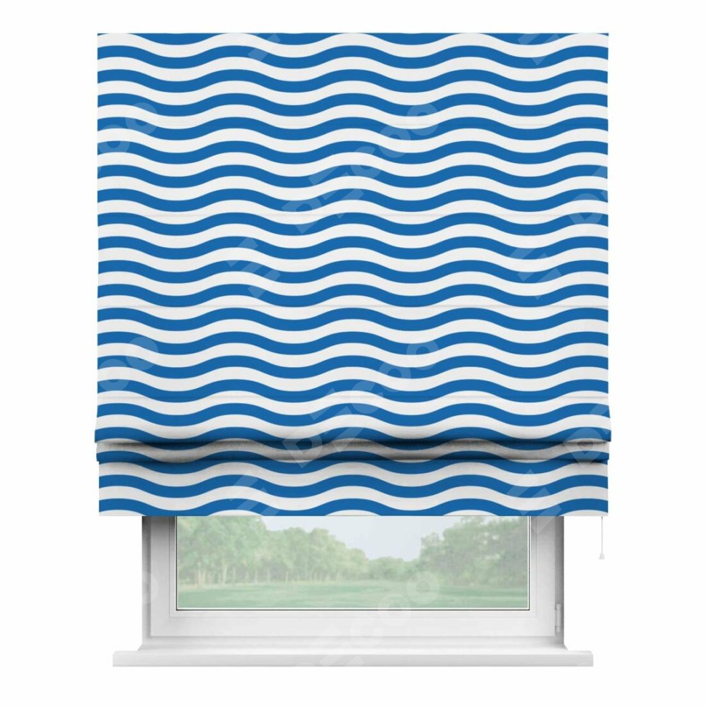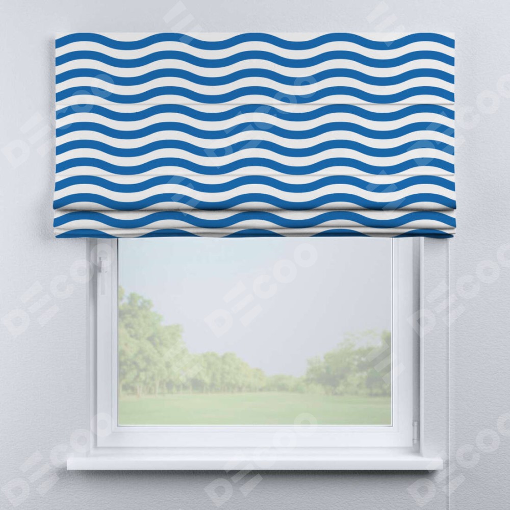 Римская штора производителя «Cortin», используется для проёма, пошита из ткани блэкаут с нанесением сублимационной печати «Волнистые линии». Имеет универсальный механизм и подходит для монтажа: на потолок, на стену и в нишу.