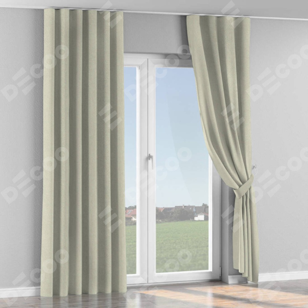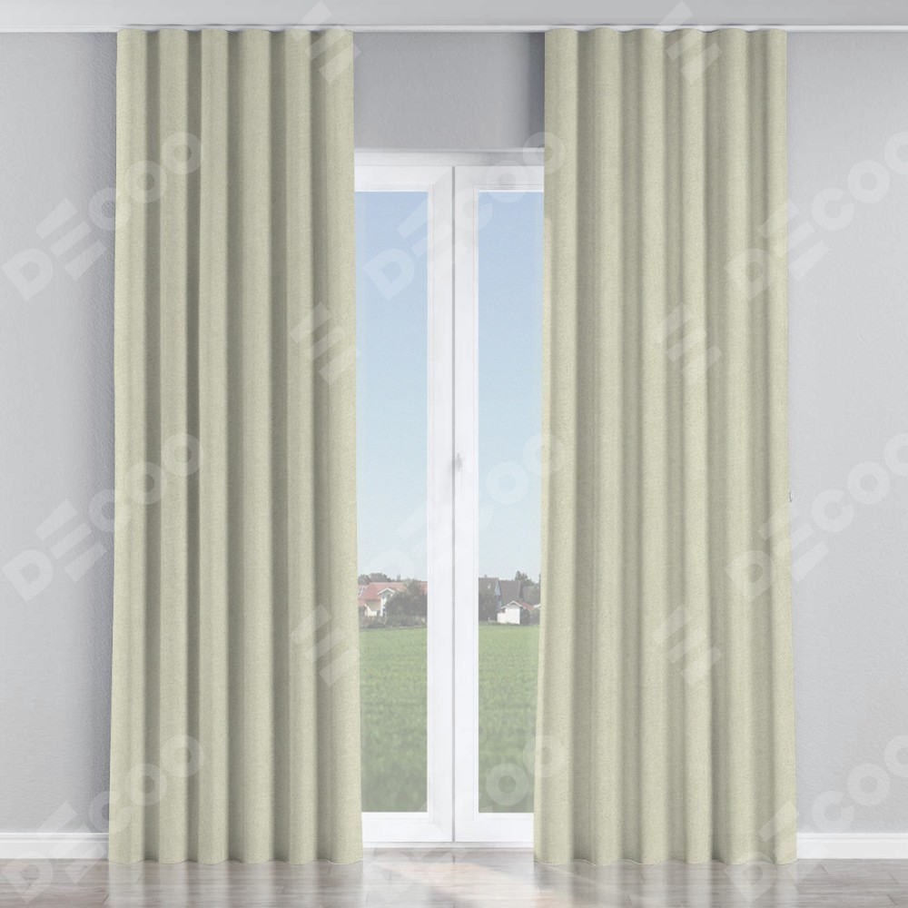 Комплект прямых штор, от производителя «Cortin», пошиты из ткани твид блэкаут шампань, артикул ткани 90929. С изнаночной стороны в верхней части штор пристрачивается шторная лента с декоративными складками «Волна». Для создания элегантных складок прямые шторы шьются по стандарту с коэффициентом 1:2 (на 100 см. ширины проёма 200 см. ширины ткани).