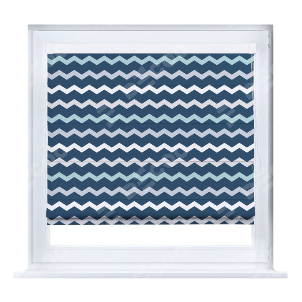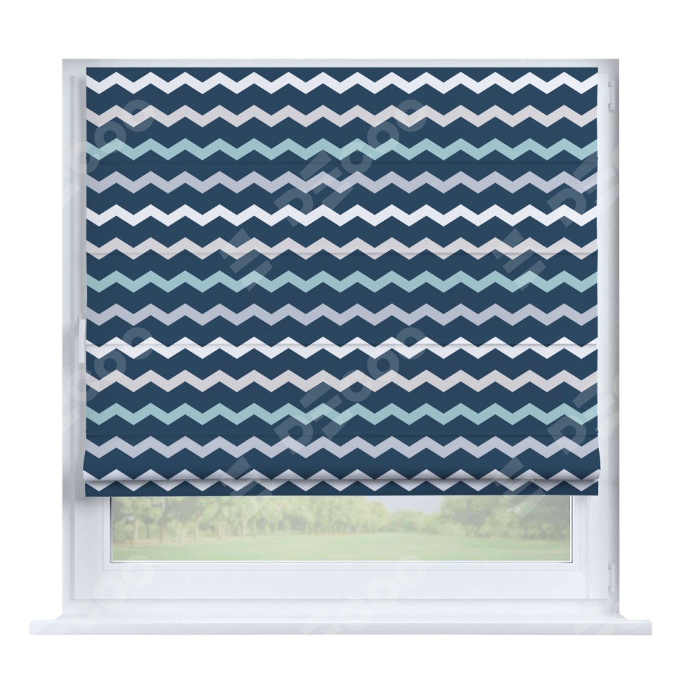Римская штора производителя «Cortin», устанавливается на створку окна, пошита из ткани блэкаут с нанесением сублимационной печати «Морской шеврон». Штора шьётся по индивидуальным размерам, для данного типа римской шторы возможная ширина от 35 до 150 см., высота до 250 см.