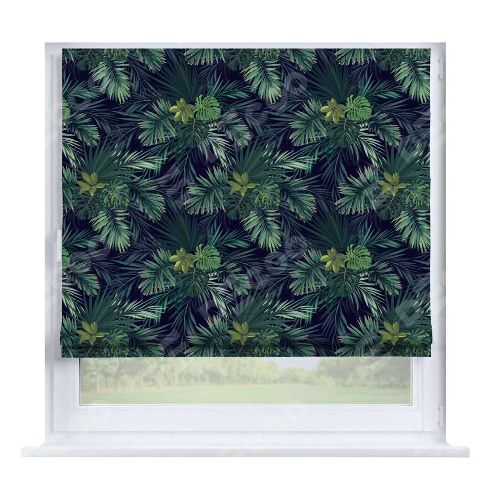 Римская штора производителя «Cortin», устанавливается на створку окна, пошита из ткани блэкаут с нанесением сублимационной печати «Пальмовые листья». Штора шьётся по индивидуальным размерам, для данного типа римской шторы возможная ширина от 35 до 150 см., высота до 250 см.