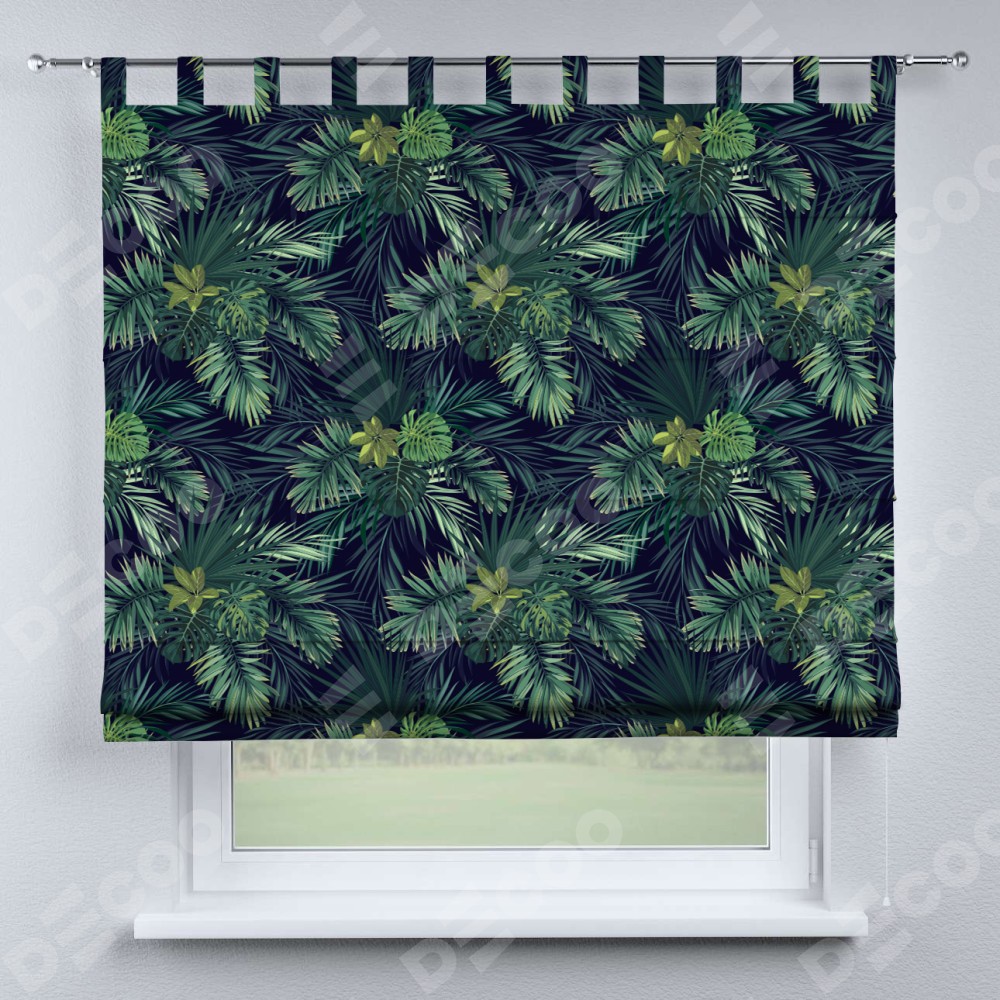 Римская штора производителя «Cortin», используется для проёма, пошита из ткани блэкаут с нанесением сублимационной печати «Пальмовые листья». Данная модель пошита на петлях, комплектуется на выбор круглым карнизом и подходит для монтажа на стену. Римская штора на петлях имеет простую систему регулировки высоты, отличительным преимуществом данной модели является простой способ монтажа. Достаточно повесить ее на трубу и штора готова!