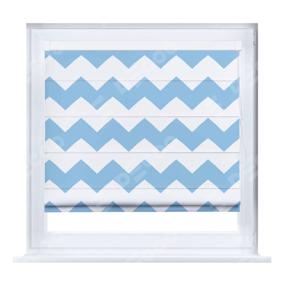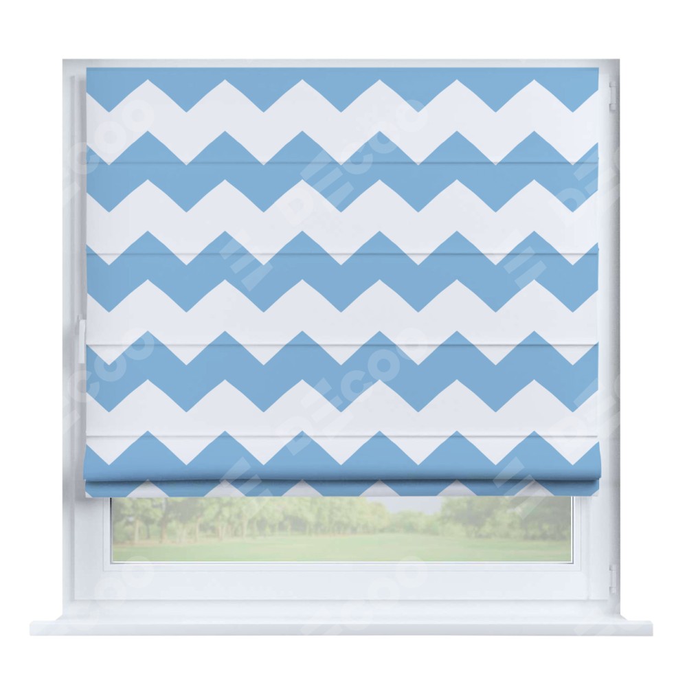 Римская штора производителя «Cortin», устанавливается на створку окна, пошита из ткани блэкаут с нанесением сублимационной печати «Зигзаг крупный». Штора шьётся по индивидуальным размерам, для данного типа римской шторы возможная ширина от 35 до 150 см., высота до 250 см.