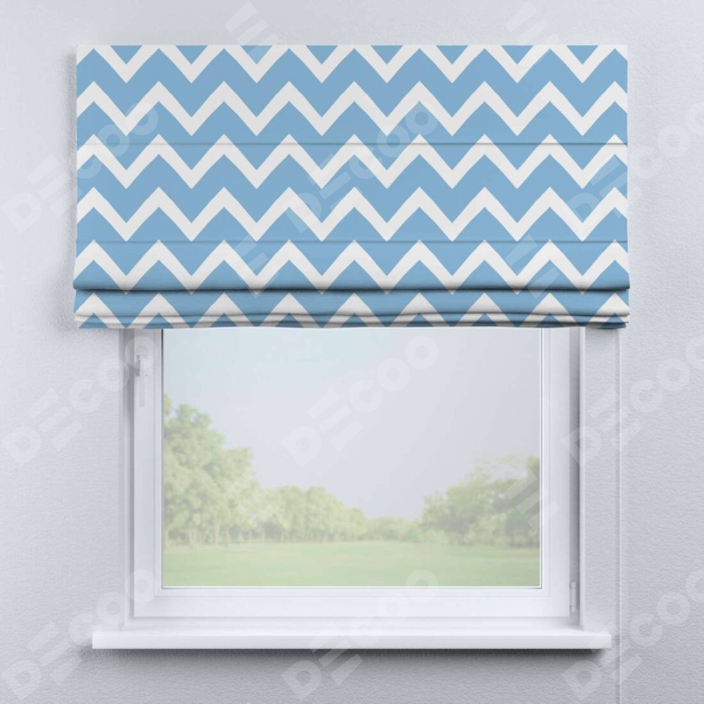 Римская штора производителя «Cortin», используется для проёма, пошита из ткани блэкаут с нанесением сублимационной печати «Зигзаг средний». Имеет универсальный механизм и подходит для монтажа: на потолок, на стену и в нишу.