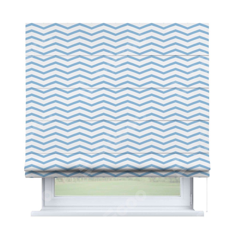 Римская штора производителя «Cortin», используется для проёма, пошита из ткани блэкаут с нанесением сублимационной печати «Зигзаг мелкий». Имеет универсальный механизм и подходит для монтажа: на потолок, на стену и в нишу.