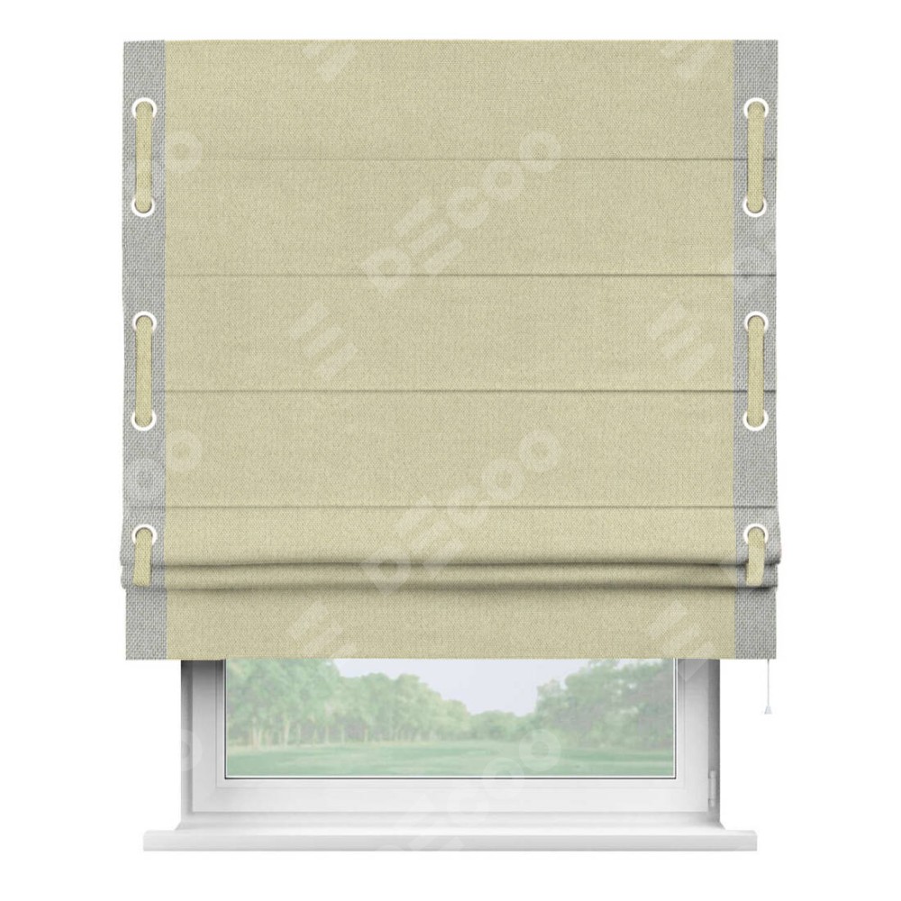 Римская штора производителя «Cortin», используется для проёма, пошита из ткани лён димаут шампань, артикул 90994. Отделка шторы кантом «Стрим Дуо» на кантах расположены люверсы с пояском, ткань для канта используется лён димаут разной расцветки на выбор. Ткань для пояска обычно используется из основной ткани шторы, а так же можно сделать из любой расцветки по желанию. Имеет универсальный механизм и подходит для монтажа: на потолок, на стену и в нишу.