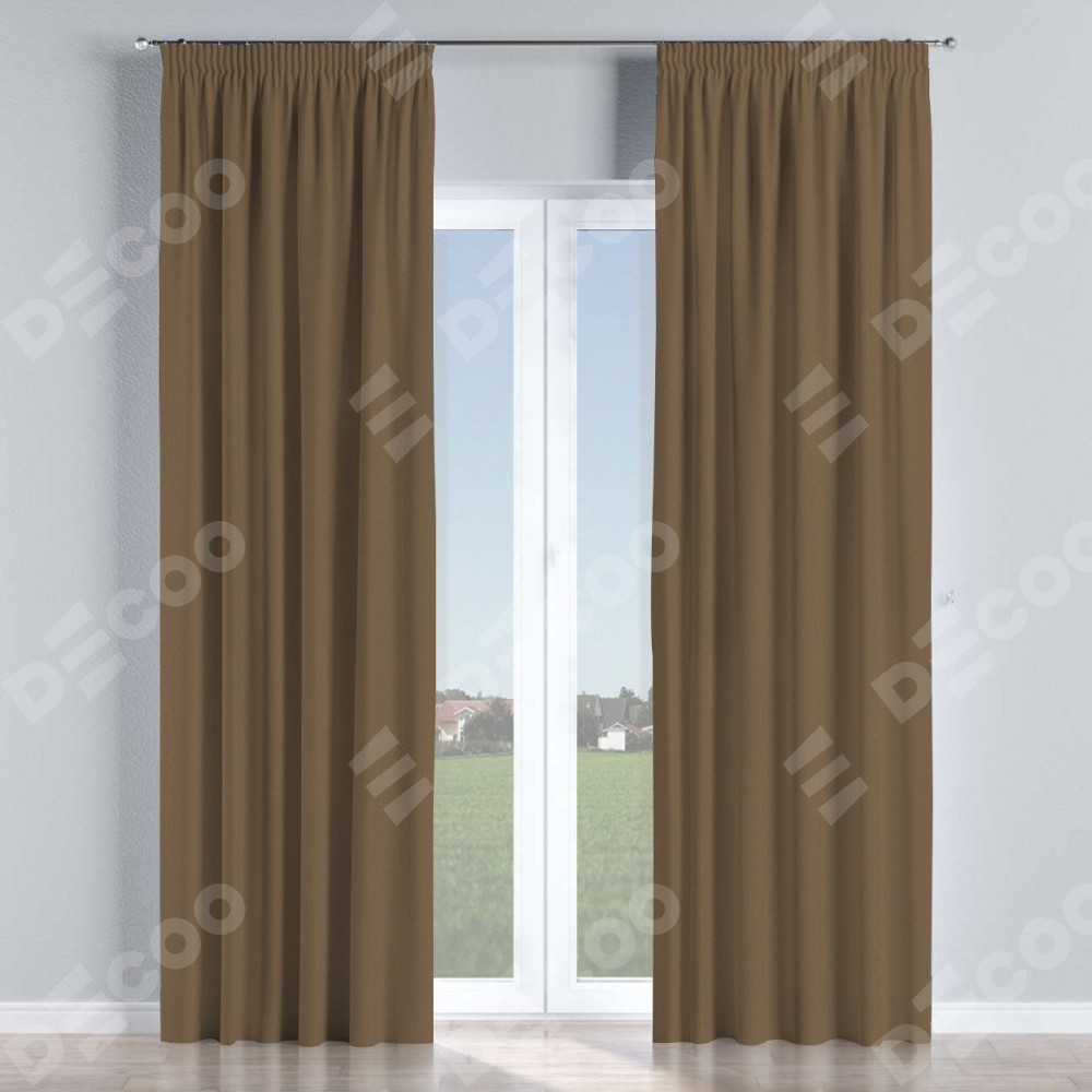 Комплект прямых штор, от производителя «Cortin», пошиты из ткани блэкаут однотонный коричневый, артикул ткани 91334. С изнаночной стороны в верхней части штор пристрачивается шторная лента с декоративными складками «Карандаш». Для создания элегантных складок прямые шторы шьются по стандарту с коэффициентом 1:2 (на 100 см. ширины проёма 200 см. ширины ткани).