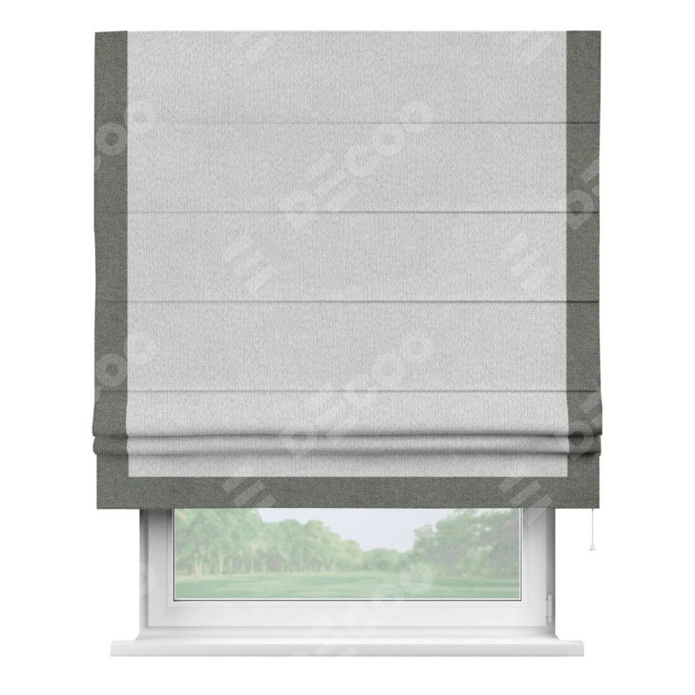 Римская штора производителя «Cortin», используется для проёма, пошита из ткани лён димаут светло-бежевый, артикул 90993. Отделка шторы кантом «Виктория», ткань для канта используется из льна димаут разной расцветки на выбор. Имеет универсальный механизм и подходит для монтажа: на потолок, на стену и в нишу.