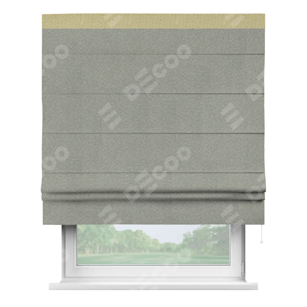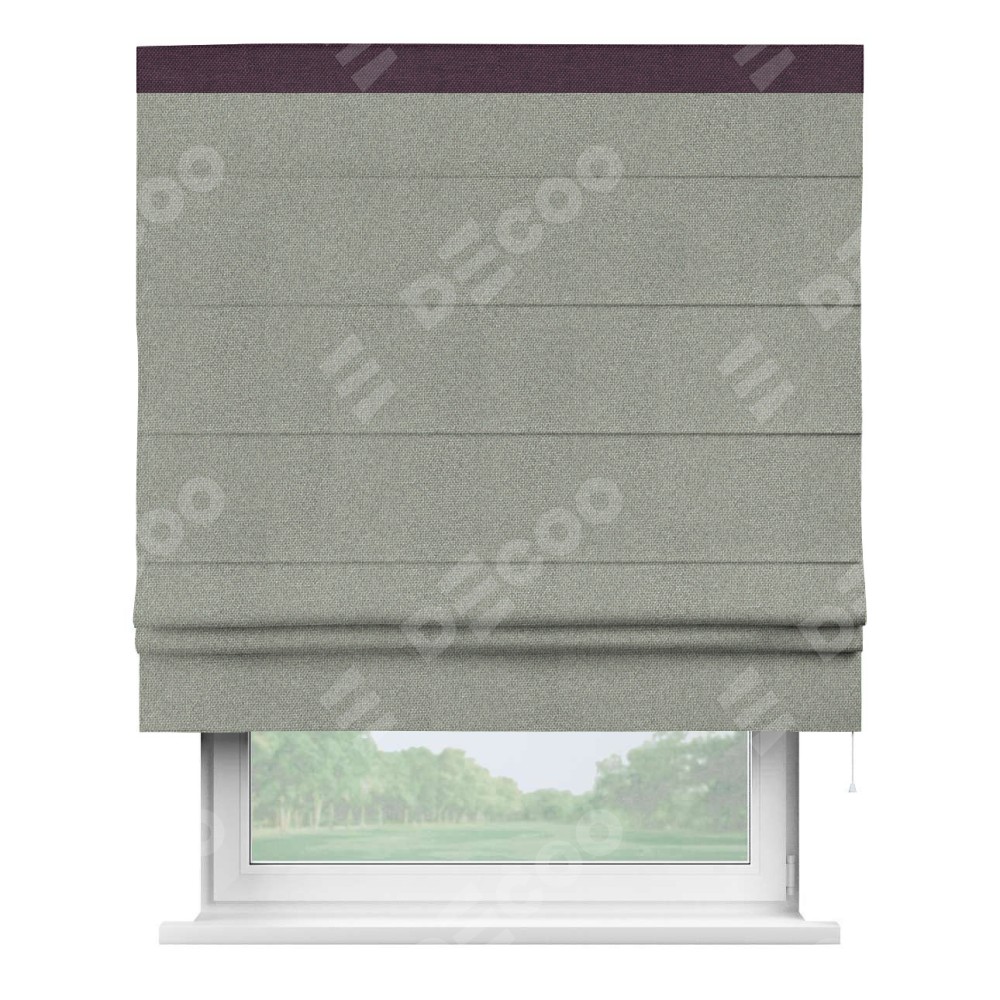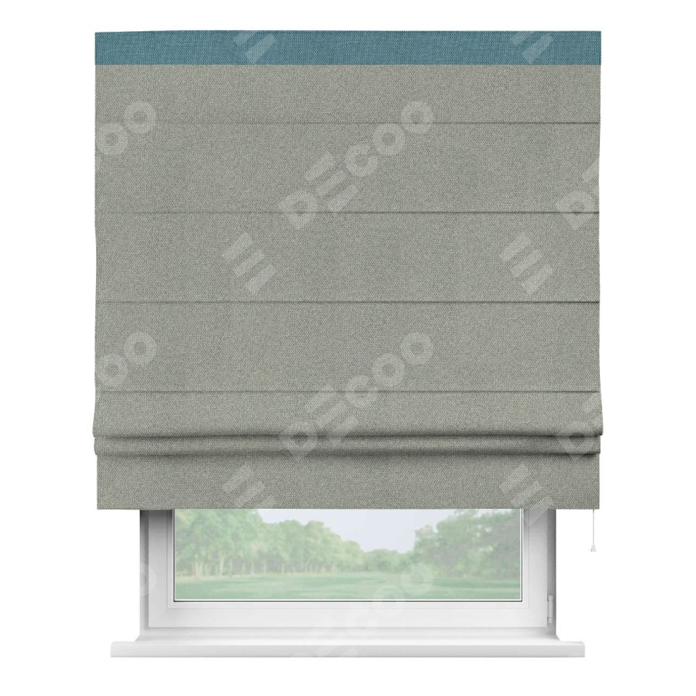 Римская штора производителя «Cortin», используется для проёма, пошита из ткани лён димаут серый, артикул 91009. Отделка шторы кантом «Кинг», ткань для канта используется из льна димаут разной расцветки на выбор. Имеет универсальный механизм и подходит для монтажа: на потолок, на стену и в нишу.