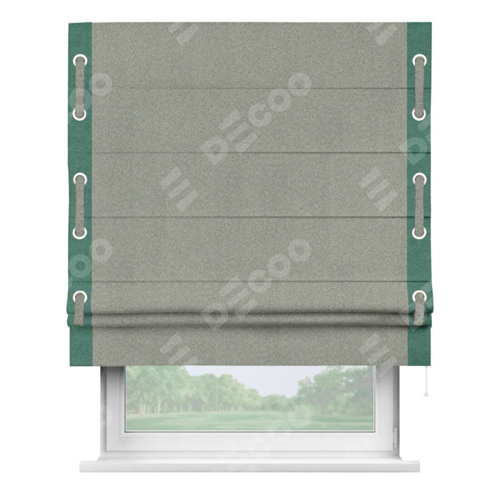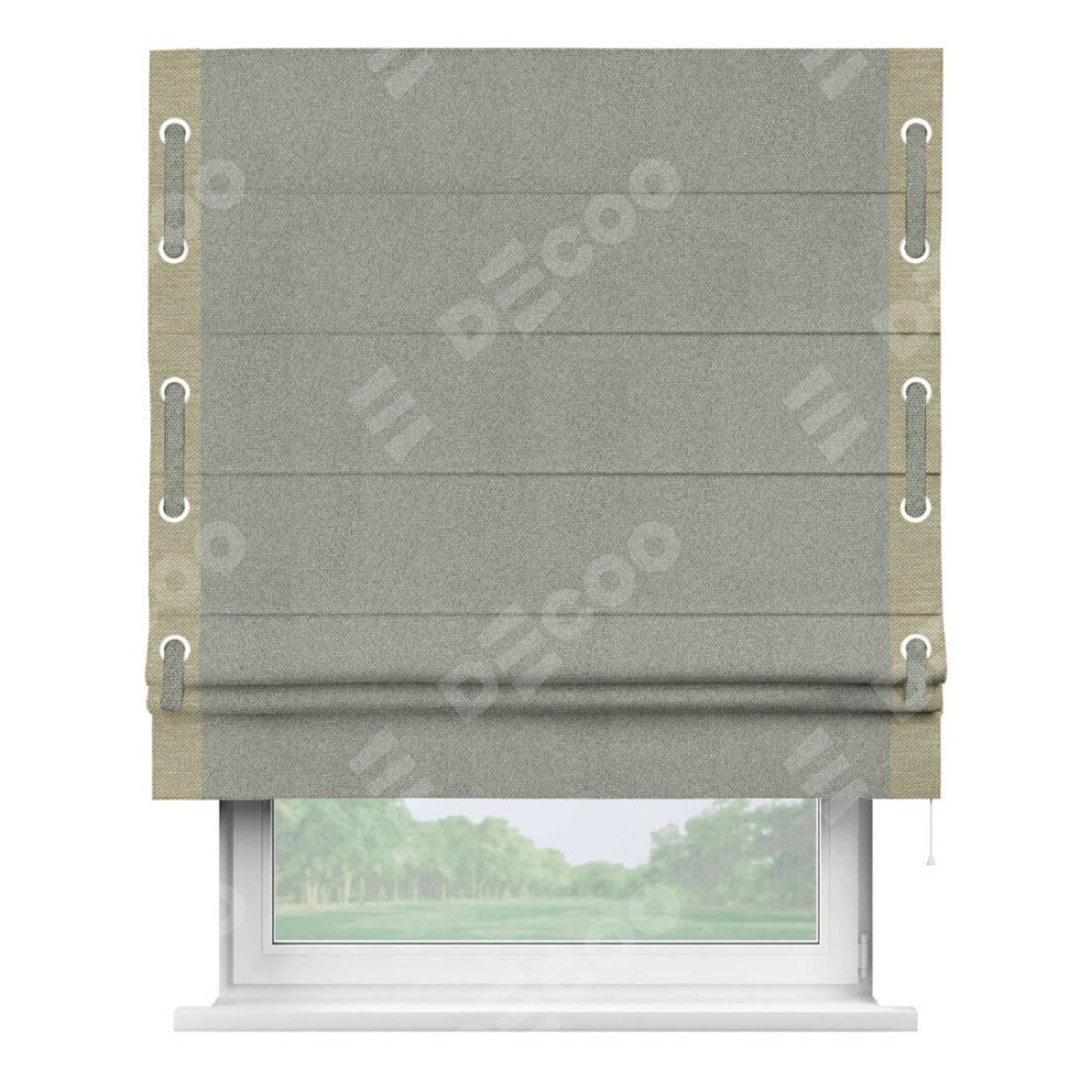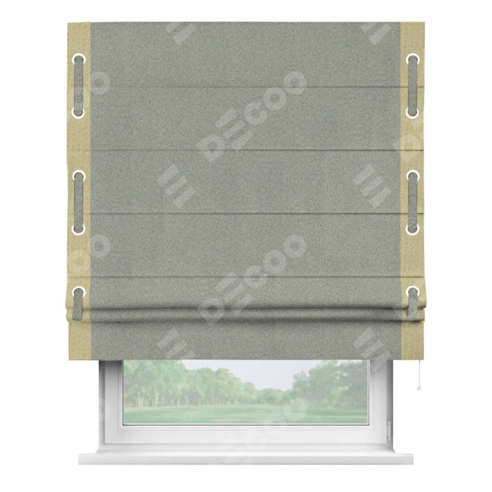 Римская штора «Кортин» для проема, лён димаут серый с кантом Стрим Дуо (люверсы с пояском)