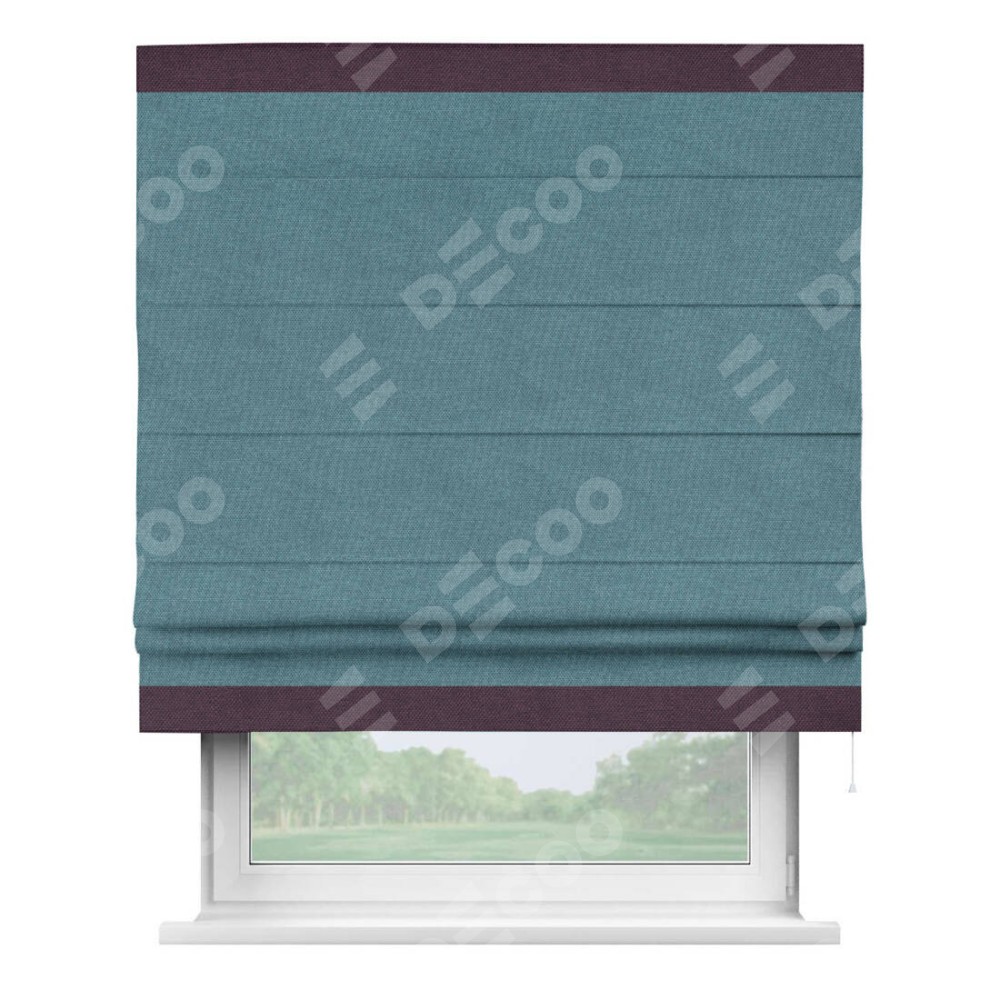 Римская штора производителя «Cortin», используется для проёма, пошита из ткани лён димаут светло-синий, артикул 91007. Отделка шторы кантом «Горизонт», ткань для канта используется из льна димаут разной расцветки на выбор. Имеет универсальный механизм и подходит для монтажа: на потолок, на стену и в нишу.