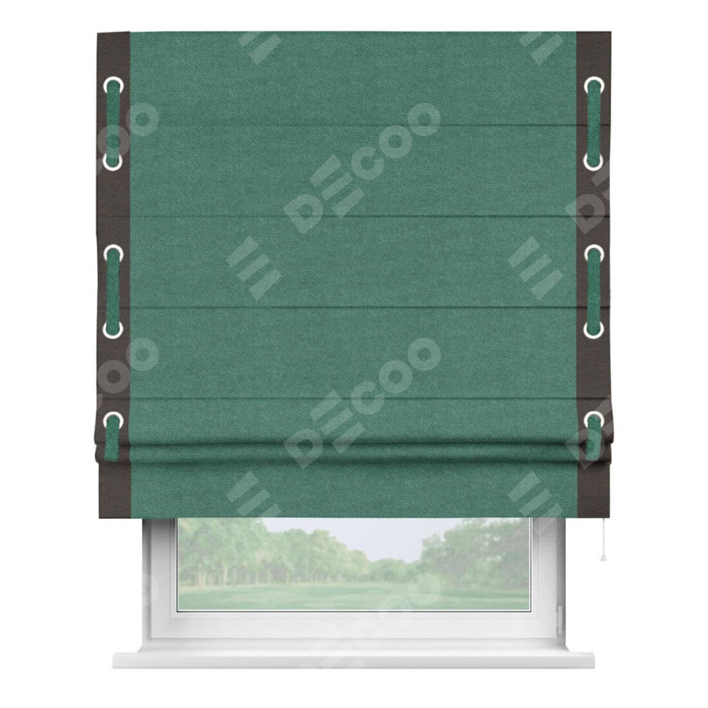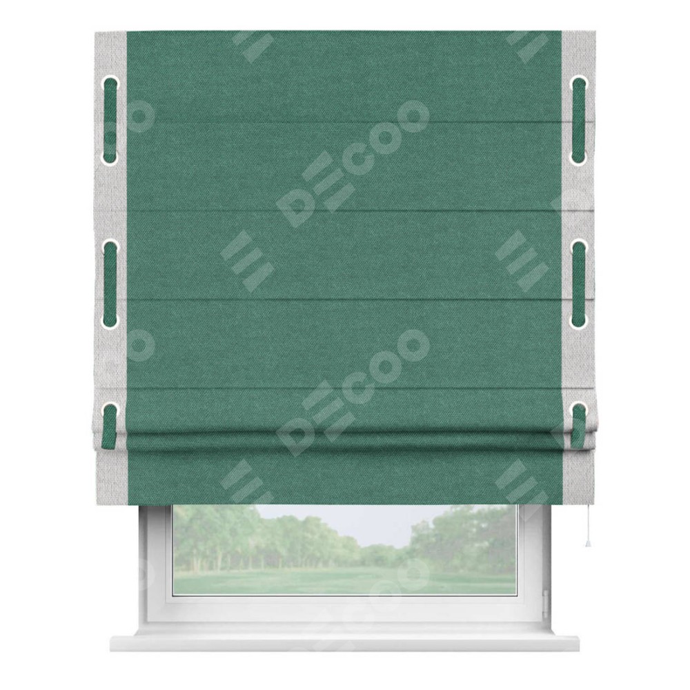 Римская штора производителя «Cortin», используется для проёма, пошита из ткани лён димаут светло-бирюзовый, артикул 91005. Отделка шторы кантом «Стрим Дуо» на кантах расположены люверсы с пояском, ткань для канта используется лён димаут разной расцветки на выбор. Ткань для пояска обычно используется из основной ткани шторы, а так же можно сделать из любой расцветки по желанию. Имеет универсальный механизм и подходит для монтажа: на потолок, на стену и в нишу.