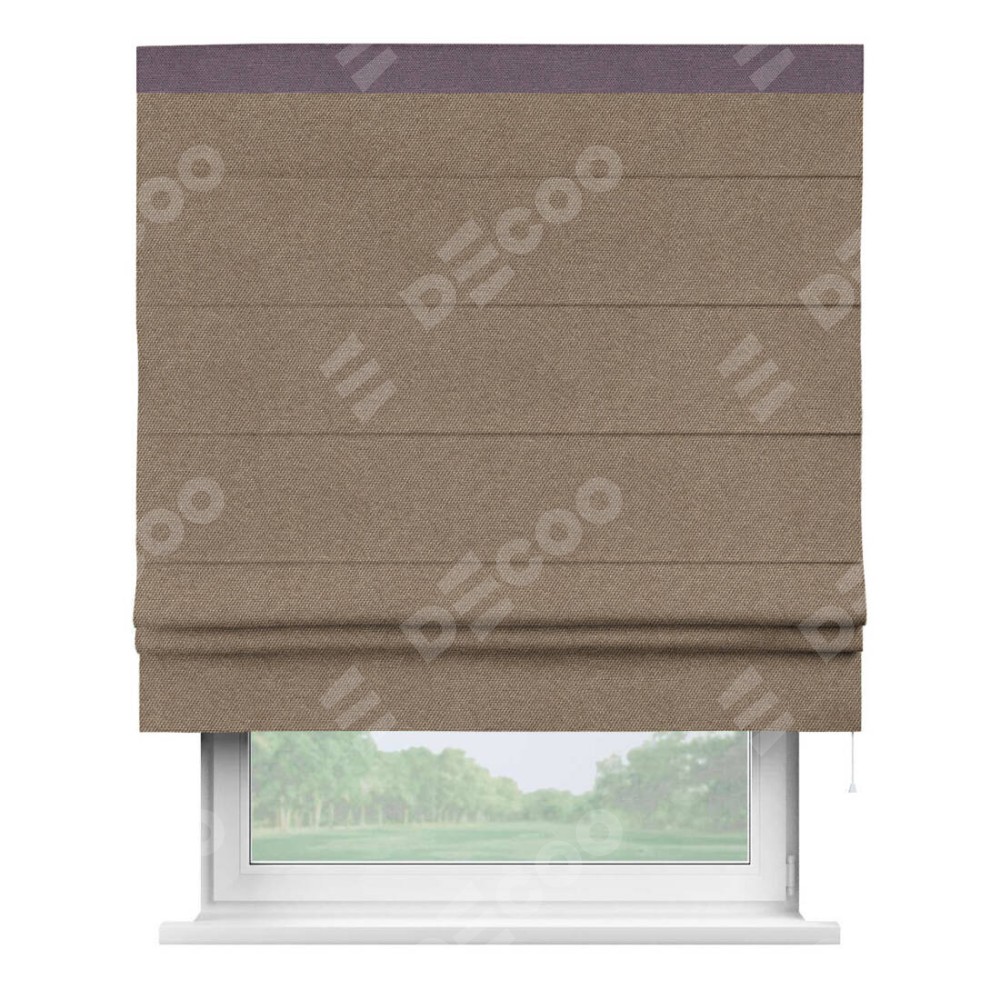 Римская штора производителя «Cortin», используется для проёма, пошита из ткани лён димаут коричневый, артикул 90996. Отделка шторы кантом «Кинг», ткань для канта используется из льна димаут разной расцветки на выбор. Имеет универсальный механизм и подходит для монтажа: на потолок, на стену и в нишу.