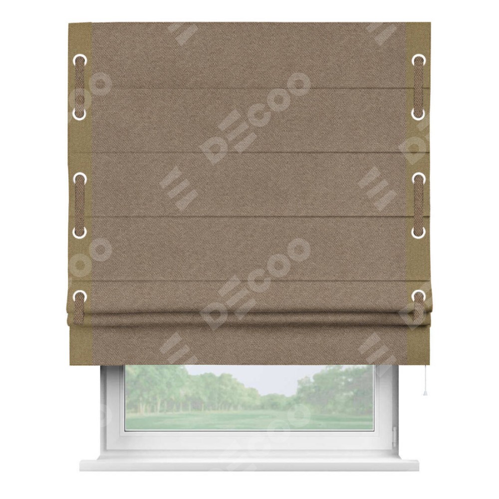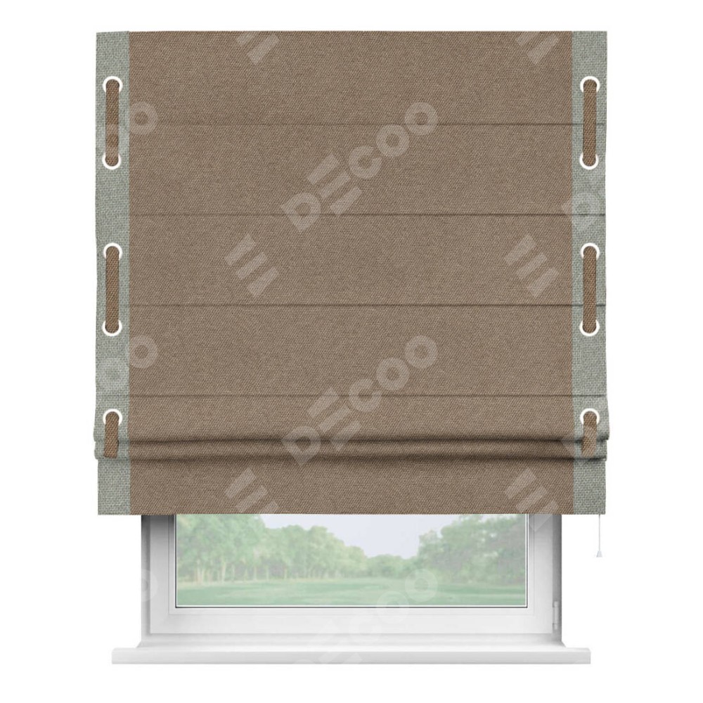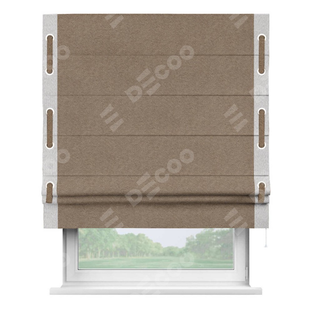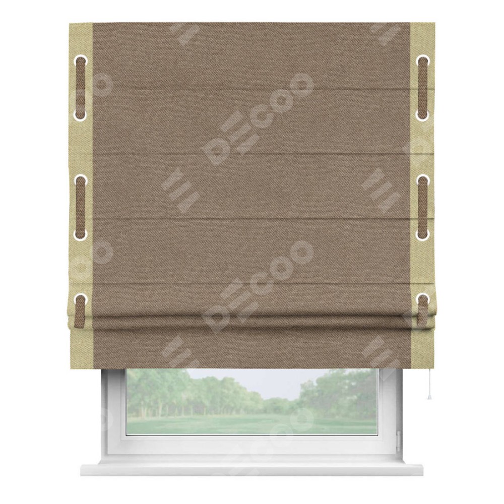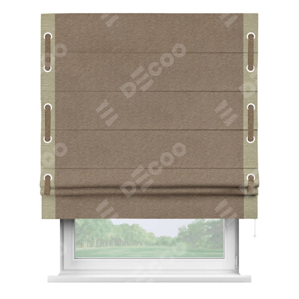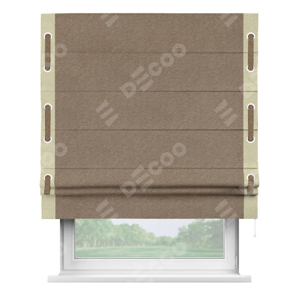 Римская штора «Кортин» для проема, лён димаут коричневый с кантом Стрим Дуо (люверсы с пояском)