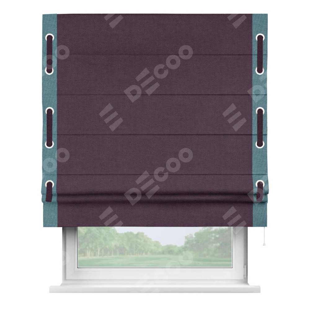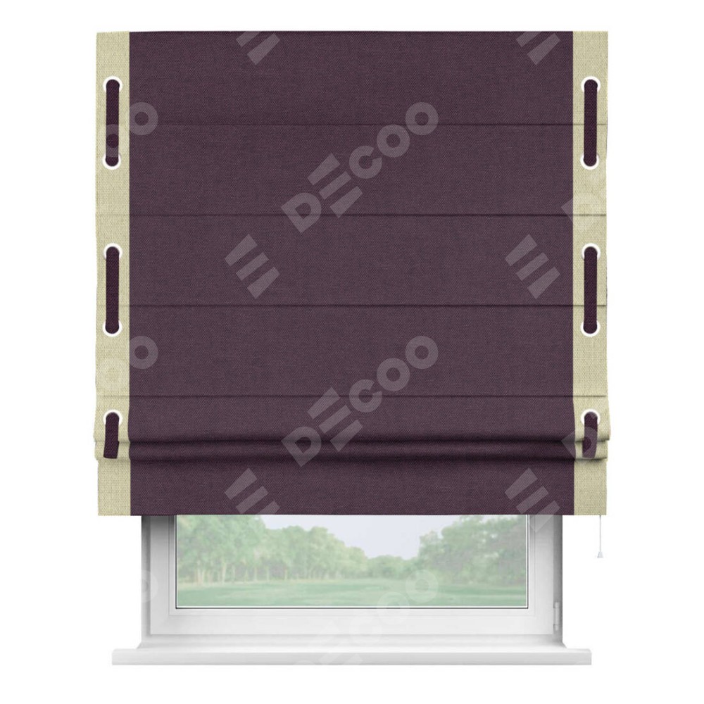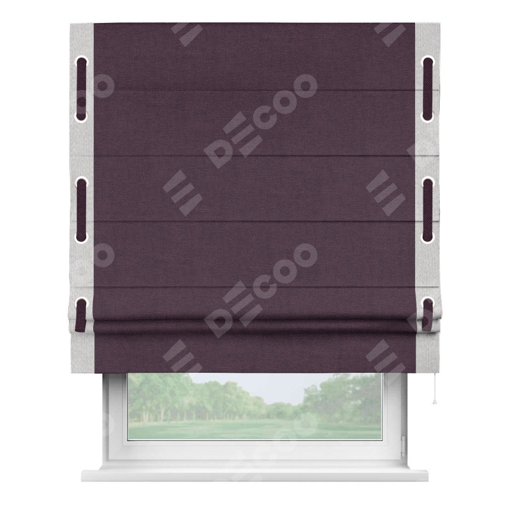 Римская штора «Кортин» для проема, лён димаут фиолетовый с кантом Стрим Дуо (люверсы с пояском)