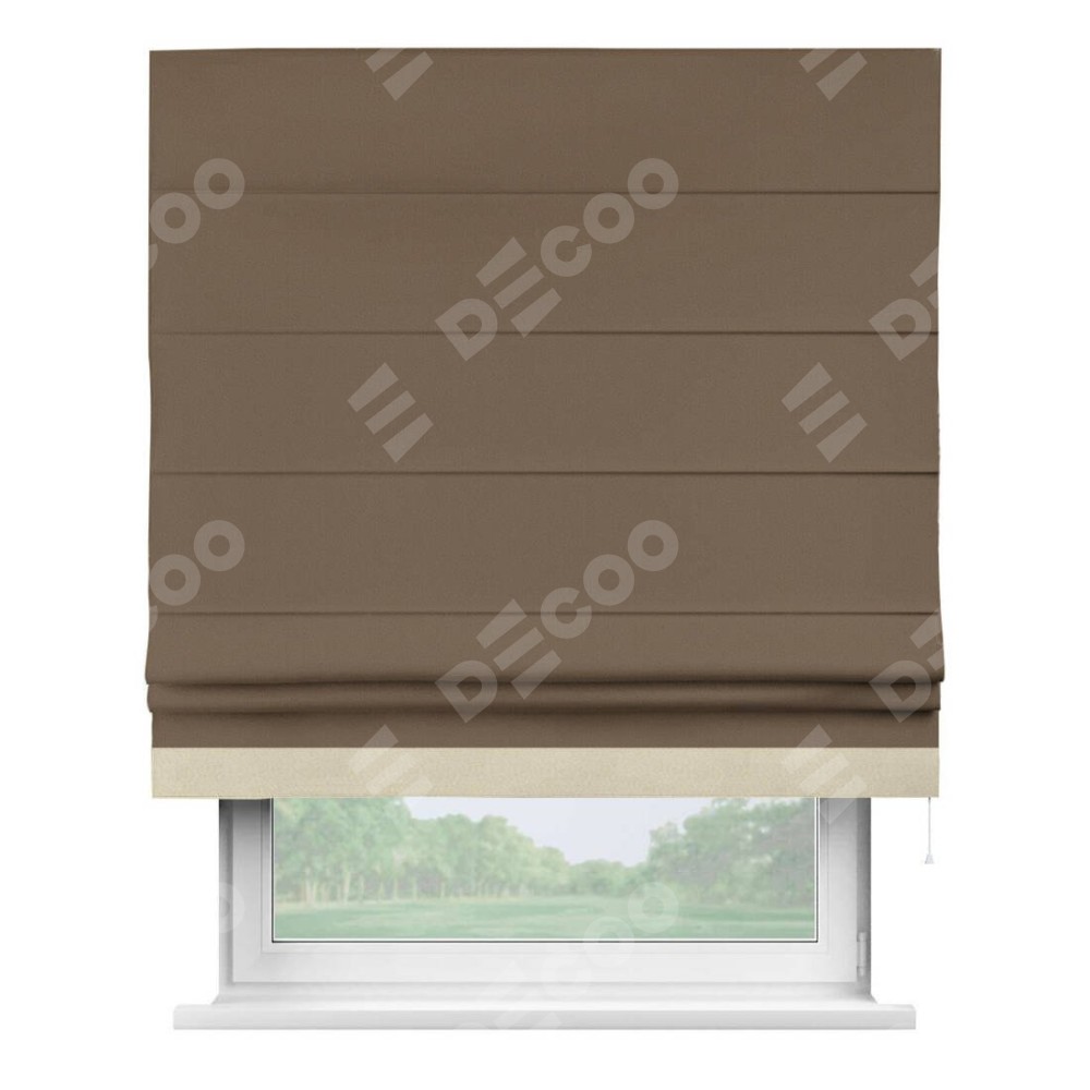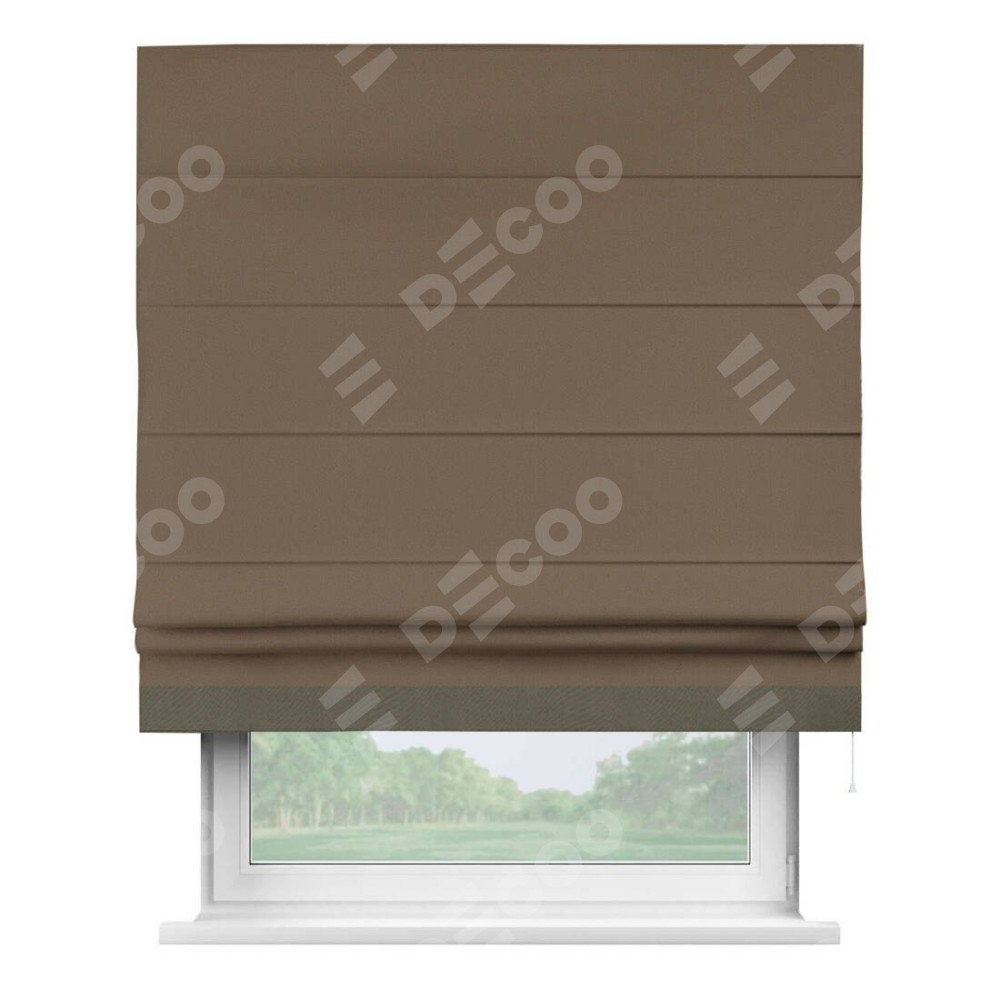 Римская штора производителя «Cortin», используется для проёма, пошита из ткани блэкаут однотонный коричневый, артикул ткани 91334. Отделка шторы кантом «Джестер», ткань для канта используется из блэкаута однотонного разной расцветки на выбор. Имеет универсальный механизм и подходит для монтажа: на потолок, на стену и в нишу.
