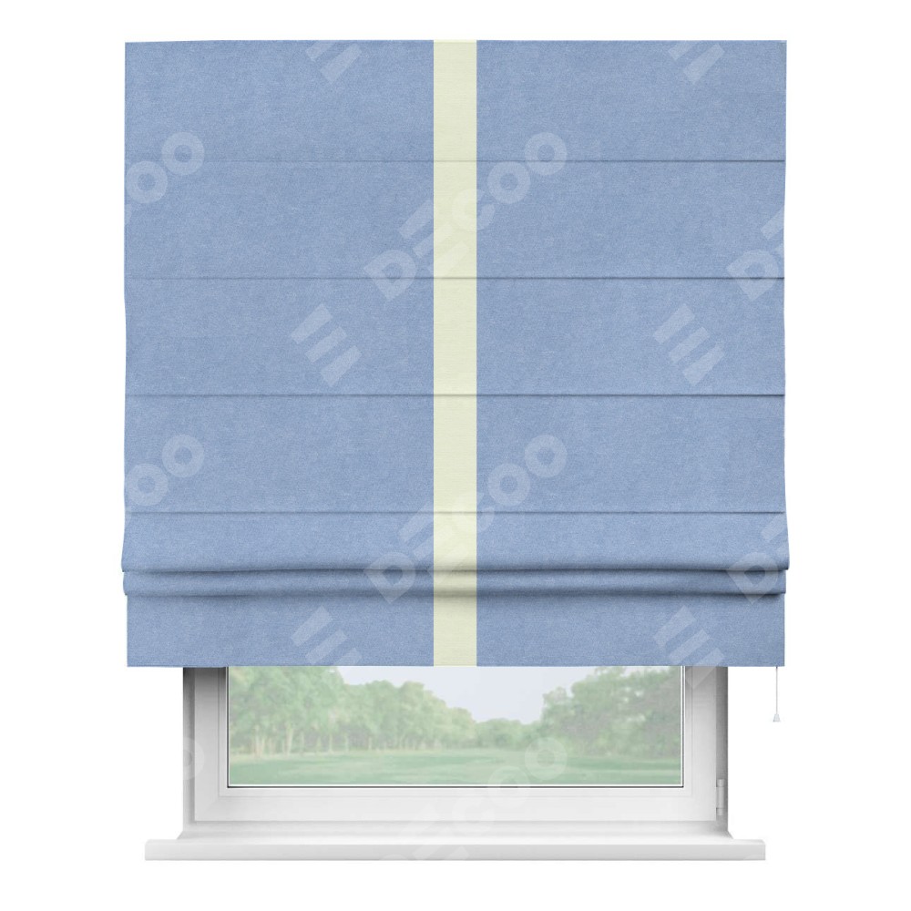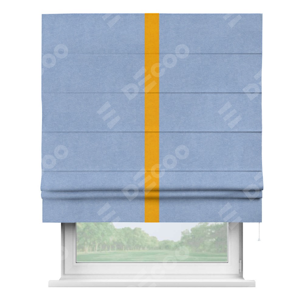 Римская штора производителя «Cortin», используется для проёма, пошита из ткани вельвет васильковый, артикул ткани 33799. Отделка шторы кантом «Хайвей», ткань для канта используется из вельвета разной расцветки на выбор. Имеет универсальный механизм и подходит для монтажа: на потолок, на стену и в нишу.