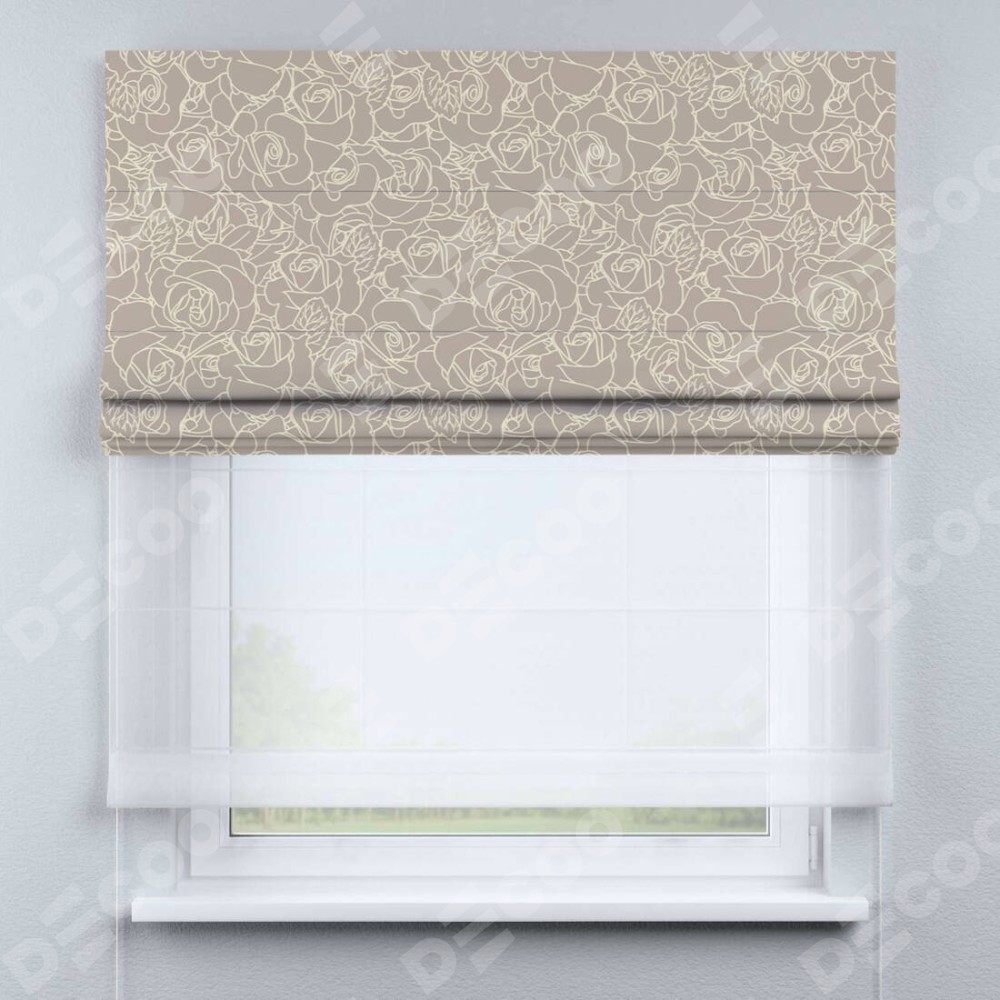 Двойная римская штора «День-ночь» от производителя Cortin предназначена для использования в проёмах. Эта штора уникальна тем, что состоит из двух полотен. На лицевой стороне находится блэкаут с нанесением сублимационной печати «Очарование роз», обеспечивающий эффективное затемнение. В комплект также входит вторая ткань — легкий белый тюль (артикул: V-01), который добавляет изящества и легкости оформлению окна. Кроме того, доступны и другие разновидности ткани тюль, выбор которых доступен по ссылке .