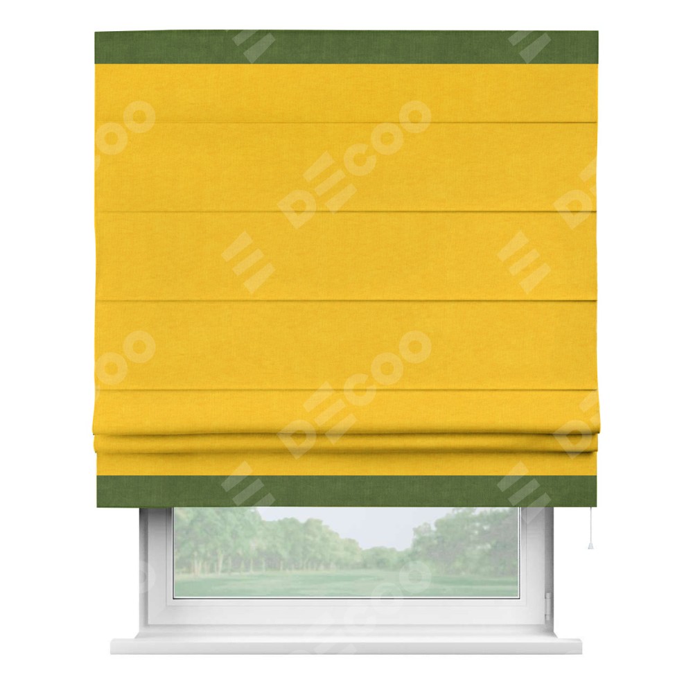 Римская штора производителя «Cortin», используется для проёма, пошита из ткани канвас желтый, артикул ткани v-344. Отделка шторы кантом «Горизонт» (трава v-473), ткань для канта используется из канваса разной расцветки на выбор. Имеет универсальный механизм и подходит для монтажа: на потолок, на стену и в нишу.