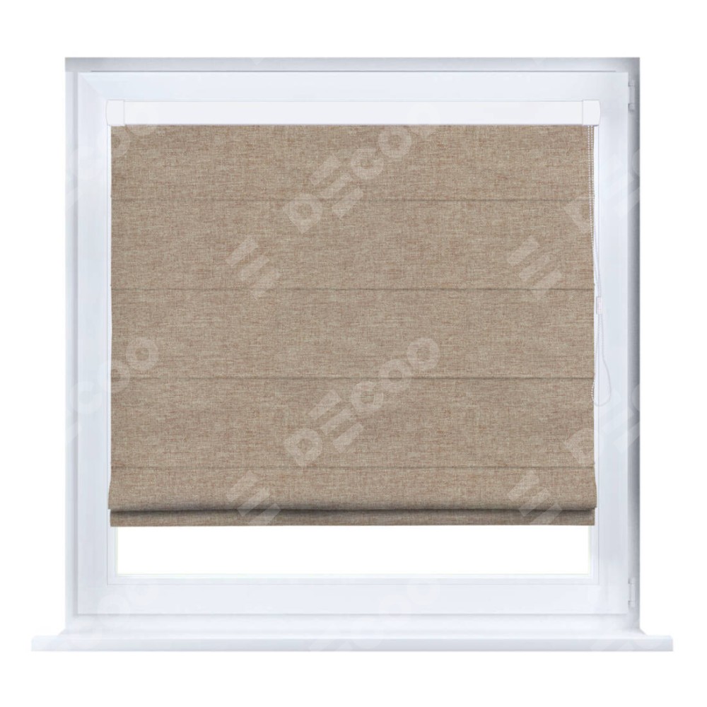 Римская штора производителя «Cortin», устанавливается на створку окна, пошита из ткани лён кашемир коричневый, артикул 21614. Штора шьётся по индивидуальным размерам, для данного типа римской шторы возможная ширина от 35 до 150 см., высота до 250 см.