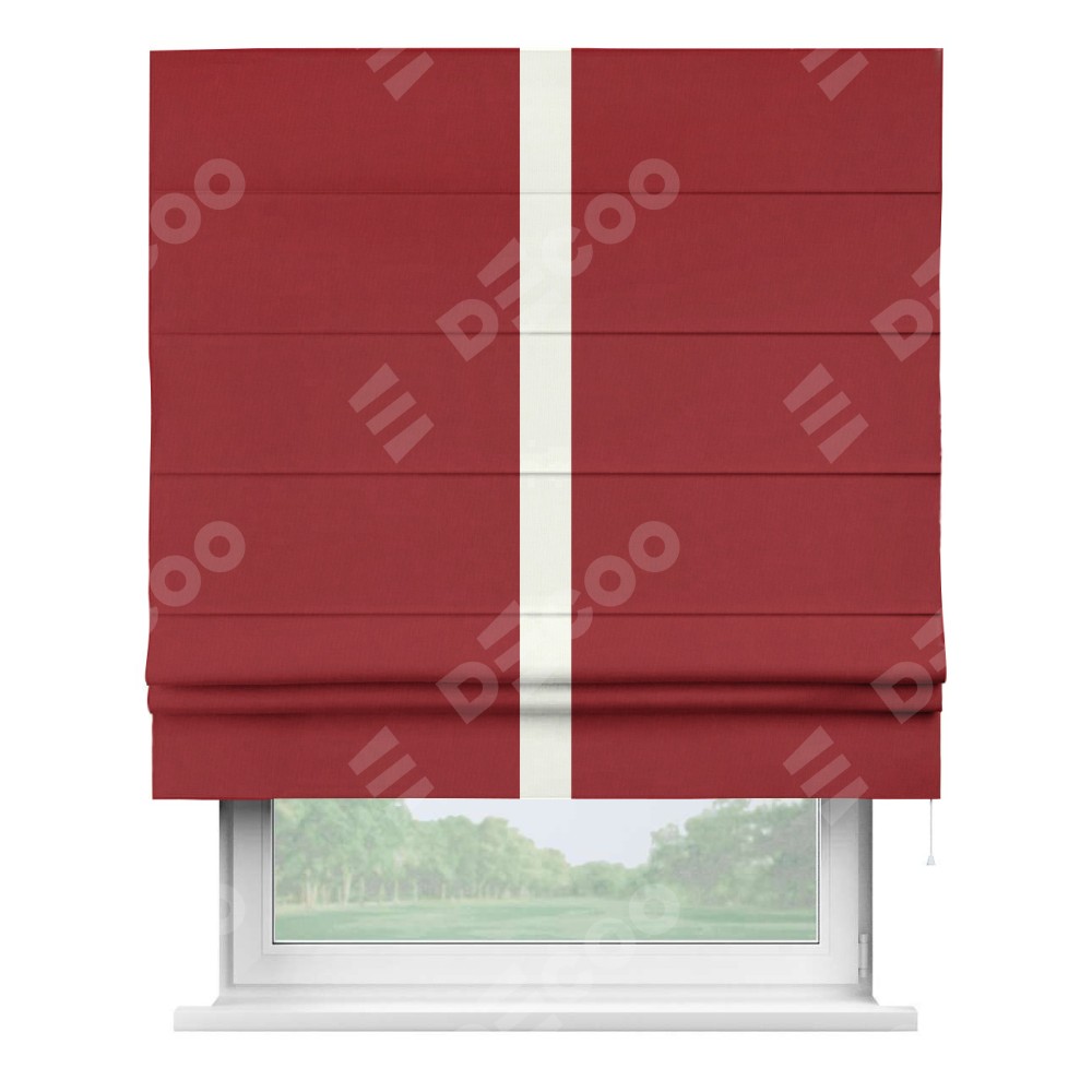Римская штора производителя «Cortin», используется для проёма, пошита из ткани канвас красный, артикул ткани v-113. Отделка шторы кантом «Хайвей» (молочный v-93), ткань для канта используется из канваса разной расцветки на выбор. Имеет универсальный механизм и подходит для монтажа: на потолок, на стену и в нишу.