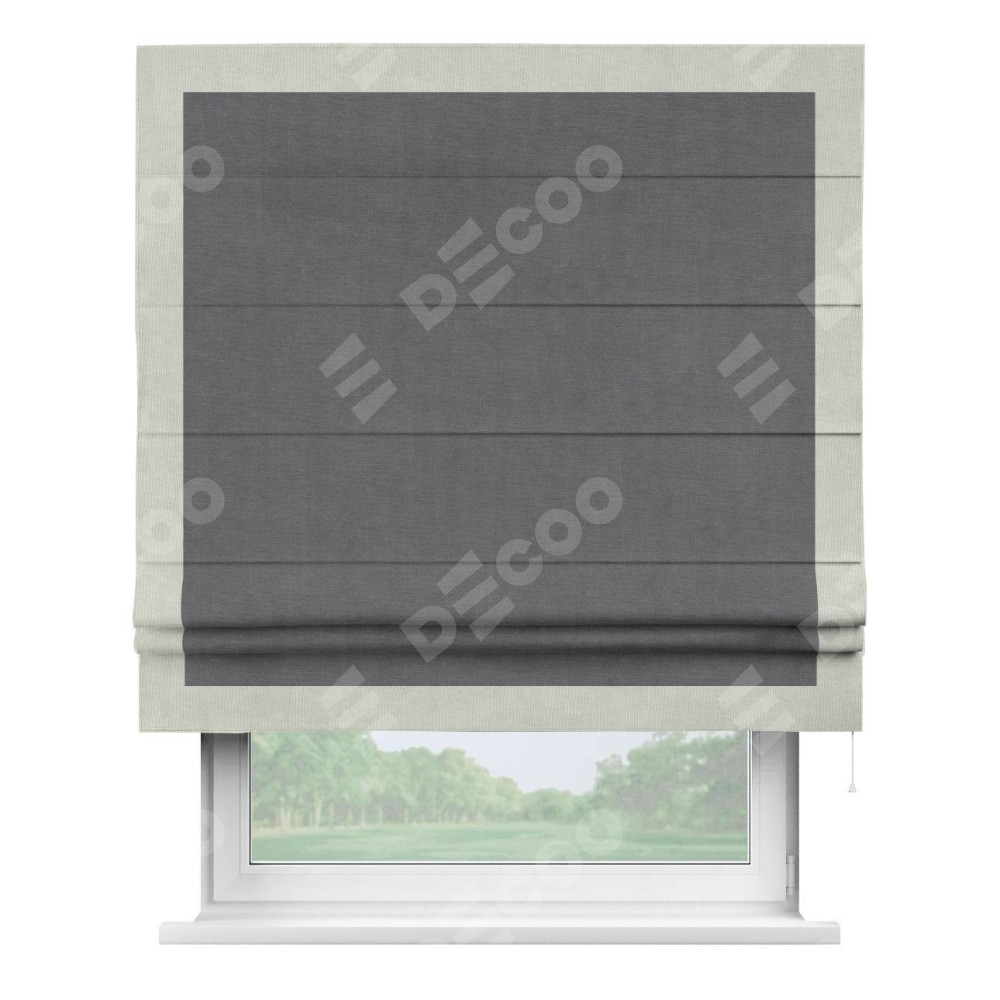 Римская штора производителя «Cortin», используется для проёма, пошита из ткани канвас мокрый асфальт, артикул ткани v-1083. Отделка шторы кантом «Чесс» (светло-серый v-371), ткань для канта используется из канваса разной расцветки на выбор. Имеет универсальный механизм и подходит для монтажа: на потолок, на стену и в нишу.