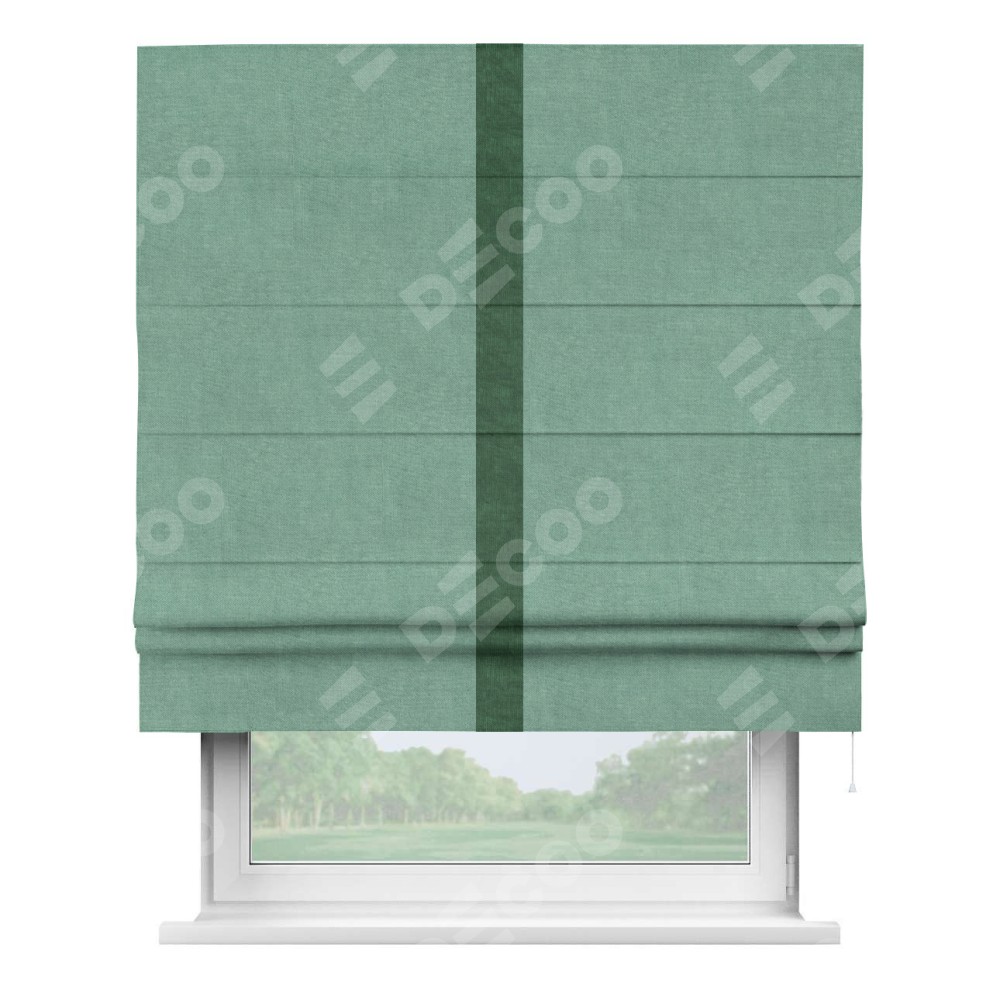 Римская штора производителя «Cortin», используется для проёма, пошита из ткани канвас мятный, артикул ткани v-248. Отделка шторы кантом «Хайвей» (тёмно-зелёный v-469), ткань для канта используется из канваса разной расцветки на выбор. Имеет универсальный механизм и подходит для монтажа: на потолок, на стену и в нишу.