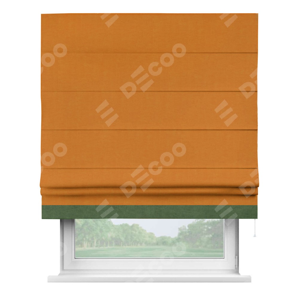 Римская штора производителя «Cortin», используется для проёма, пошита из ткани канвас оранжевый, артикул ткани v-106. Отделка шторы кантом «Джестер» (зелёный v-16), ткань для канта используется из канваса разной расцветки на выбор. Имеет универсальный механизм и подходит для монтажа: на потолок, на стену и в нишу.