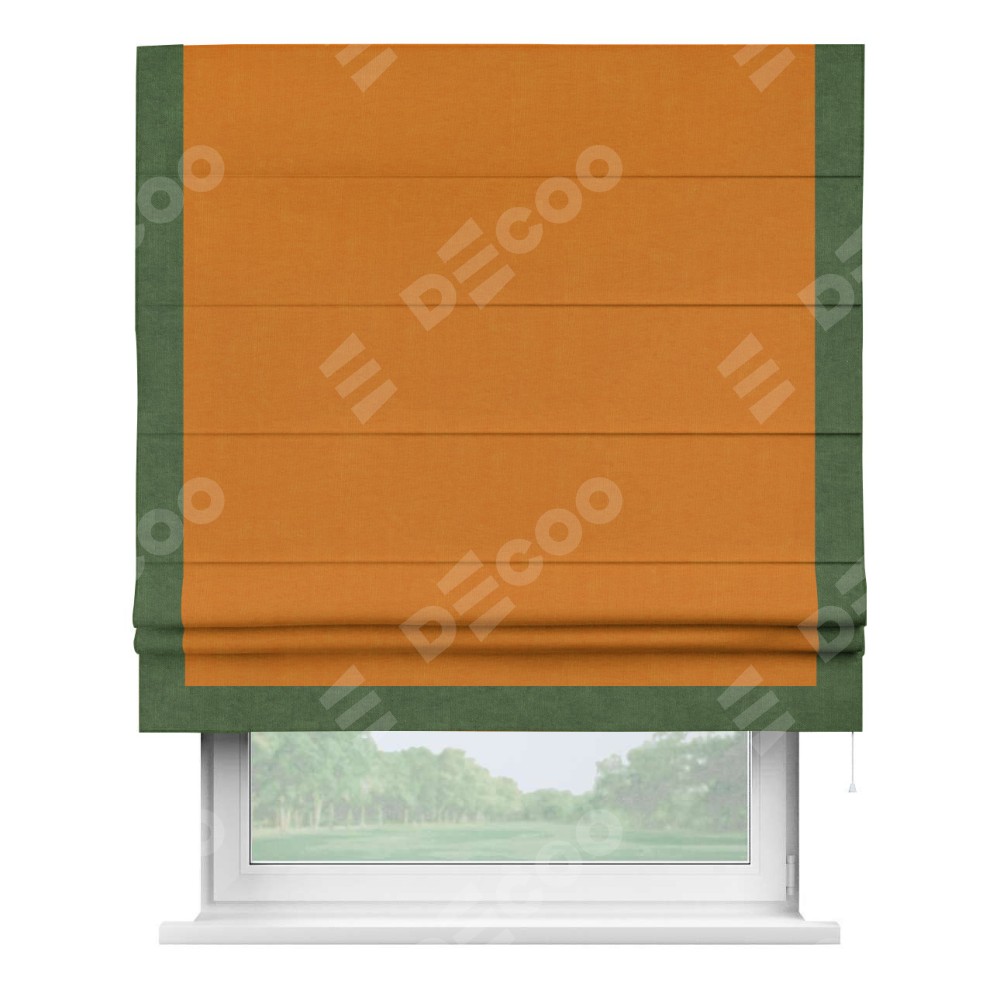 Римская штора производителя «Cortin», используется для проёма, пошита из ткани канвас оранжевый, артикул ткани v-106. Отделка шторы кантом «Виктория» (зелёный v-16), ткань для канта используется из канваса разной расцветки на выбор. Имеет универсальный механизм и подходит для монтажа: на потолок, на стену и в нишу.