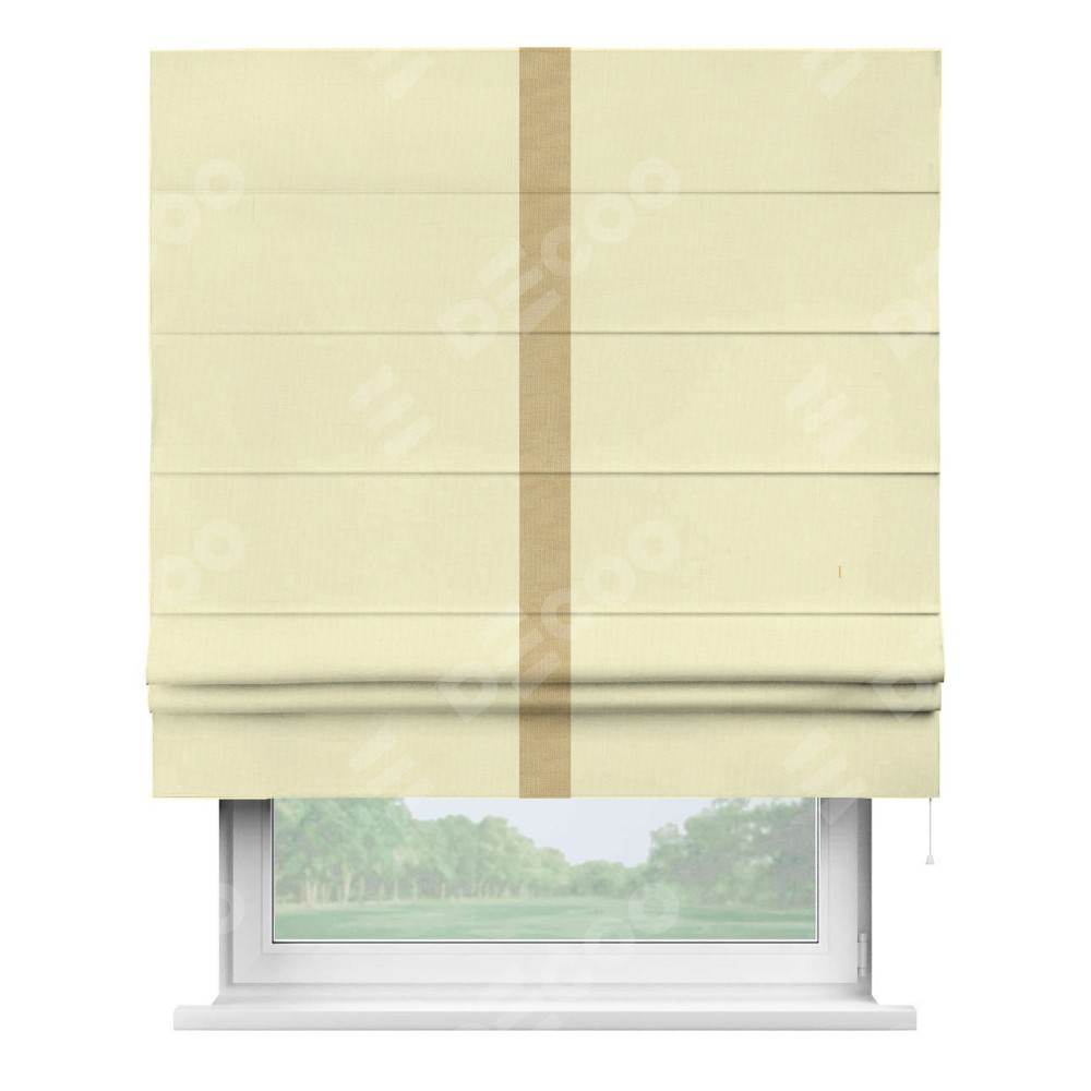 Римская штора производителя «Cortin», используется для проёма, пошита из ткани канвас светло-бежевый, артикул ткани v-250. Отделка шторы кантом «Хайвей» (абрикосовый v-448), ткань для канта используется из канваса разной расцветки на выбор. Имеет универсальный механизм и подходит для монтажа: на потолок, на стену и в нишу.