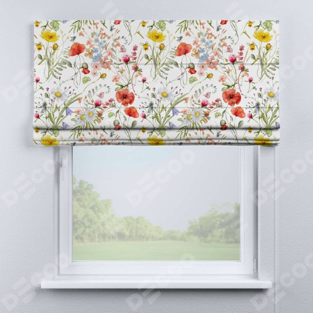 Классическая римская штора производителя «Cortin», пошита из ткани блэкаут с нанесением сублимационной печати «Полевые маки». Имеет универсальный механизм и подходит для монтажа: на потолок, на стену и в нишу.