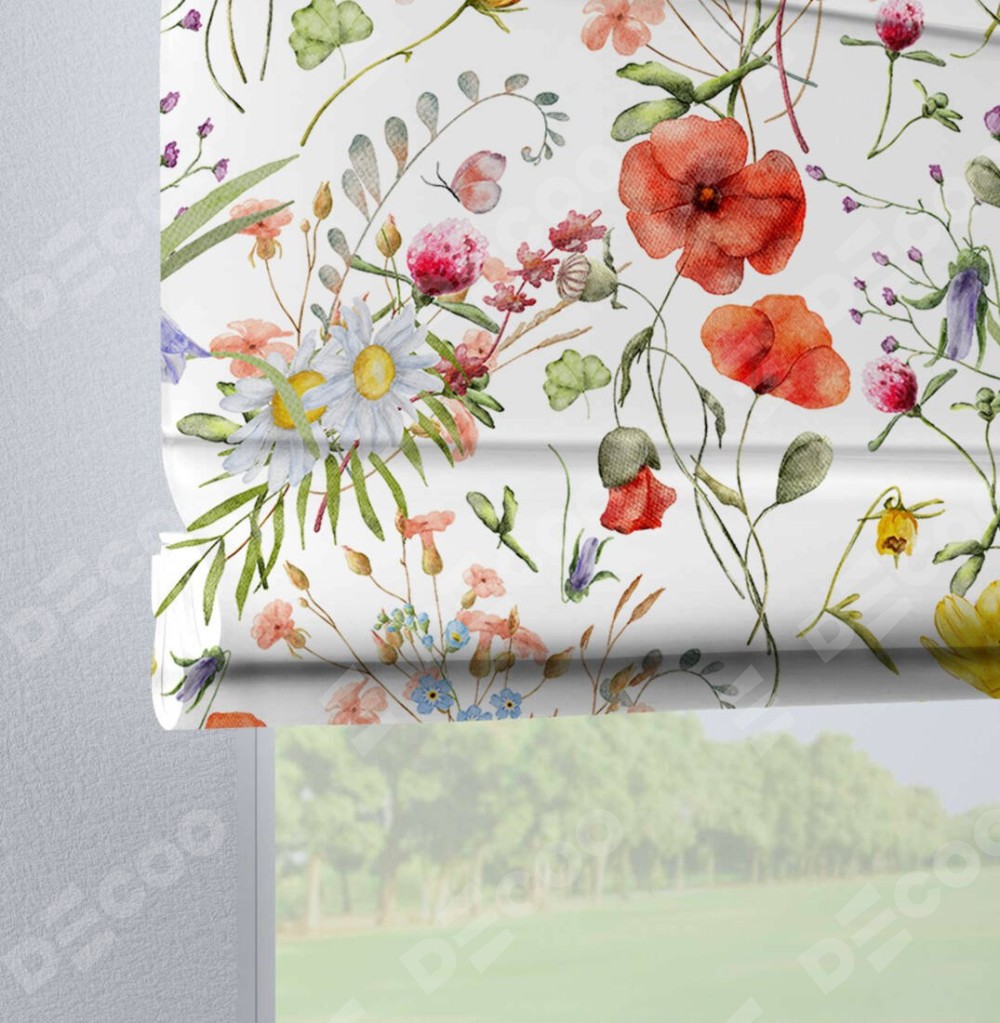 Римская штора «Кортин» на петлях «Полевые маки» отлично подойдёт для интерьера: в гостиную, на балкон и в кухню.