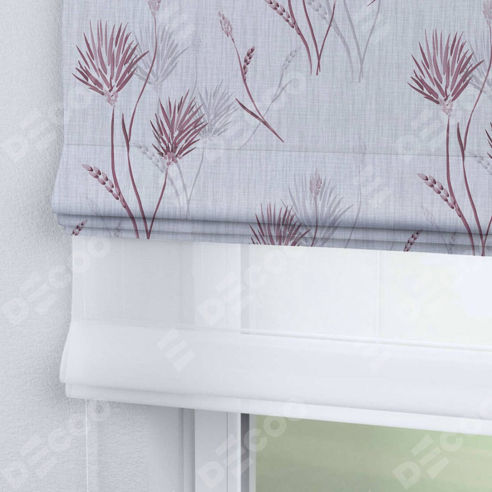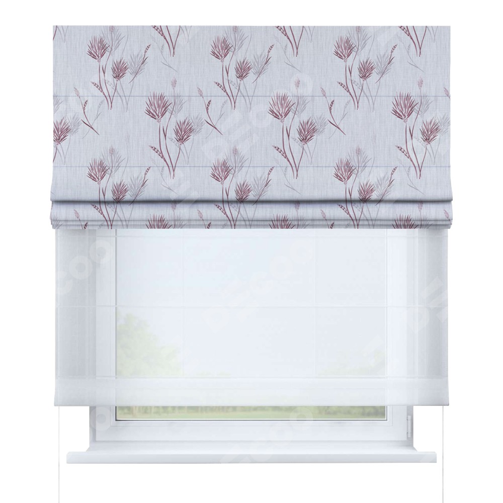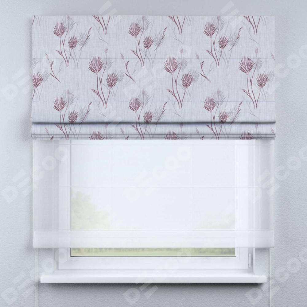 Двойная римская штора «День-ночь» от производителя Cortin предназначена для использования в проёмах. Эта штора уникальна тем, что состоит из двух полотен. На лицевой стороне находится блэкаут с нанесением сублимационной печати «Полевые травы серый», обеспечивающий эффективное затемнение. В комплект также входит вторая ткань — легкий белый тюль (артикул: V-01), который добавляет изящества и легкости оформлению окна. Кроме того, доступны и другие разновидности ткани тюль, выбор которых доступен по  ссылке .