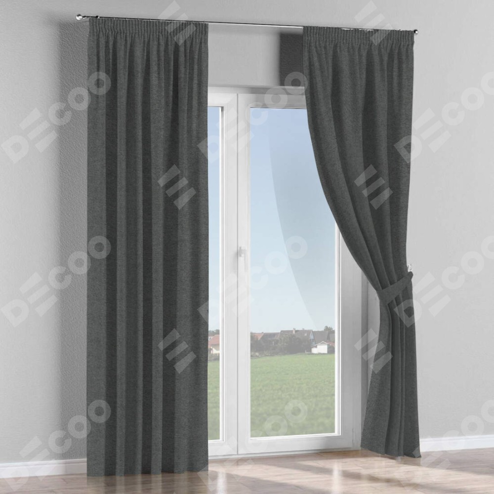 Комплект прямых штор, от производителя «Cortin», пошиты из ткани твид блэкаут тёмно-серый, артикул ткани 90938. С изнаночной стороны в верхней части штор пристрачивается шторная лента с декоративными складками «Карандаш». Для создания элегантных складок прямые шторы шьются по стандарту с коэффициентом 1:2 (на 100 см. ширины проёма 200 см. ширины ткани).