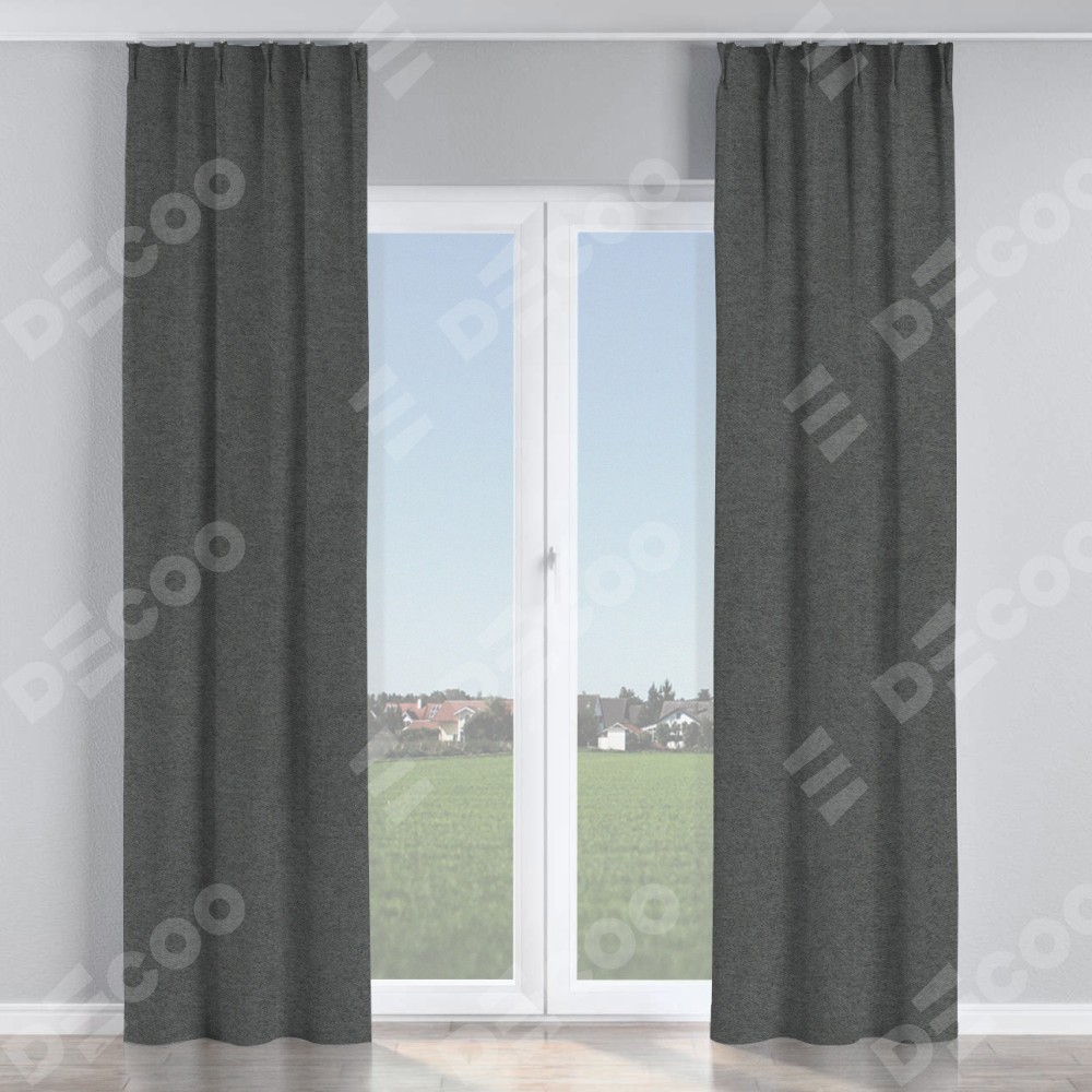 Комплект прямых штор, от производителя «Cortin», пошиты из ткани твид блэкаут тёмно-серый, артикул ткани 90938. С изнаночной стороны в верхней части штор пристрачивается шторная лента с декоративными складками «Кустик». Для создания элегантных складок прямые шторы шьются по стандарту с коэффициентом 1:2 (на 100 см. ширины проёма 200 см. ширины ткани).